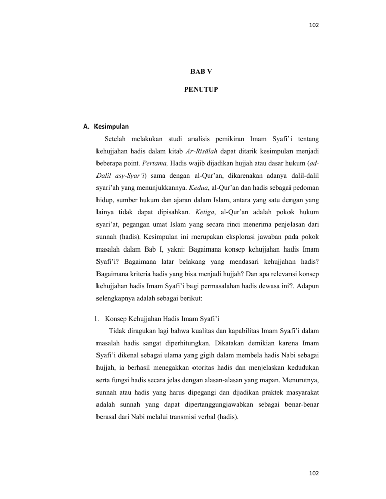 102 BAB V PENUTUP A. Kesimpulan Setelah melakukan studi analisis pemikiran Imam Syafi’i tentang kehujjahan hadis dalam kitab Ar-Risālah dapat ditarik kesimpulan menjadi beberapa point. Pertama, Hadis wajib dijadikan hujjah atau dasar hukum (adDalil asy-Syar’i) sama dengan al-Qur’an, dikarenakan adanya dalil-dalil syari’ah yang menunjukkannya. Kedua, al-Qur’an dan hadis sebagai pedoman hidup, sumber hukum dan ajaran dalam Islam, antara yang satu dengan yang lainya tidak dapat dipisahkan. Ketiga, al-Qur’an adalah pokok hukum syari’at, pegangan umat Islam yang secara rinci menerima penjelasan dari sunnah (hadis). Kesimpulan ini merupakan eksplorasi jawaban pada pokok masalah dalam Bab I, yakni: Bagaimana konsep kehujjahan hadis Imam Syafi’i? Bagaimana latar belakang yang mendasari kehujjahan hadis? Bagaimana kriteria hadis yang bisa menjadi hujjah? Dan apa relevansi konsep kehujjahan hadis Imam Syafi’i bagi permasalahan hadis dewasa ini?. Adapun selengkapnya adalah sebagai berikut: 1. Konsep Kehujjahan Hadis Imam Syafi’i Tidak diragukan lagi bahwa kualitas dan kapabilitas Imam Syafi’i dalam masalah hadis sangat diperhitungkan. Dikatakan demikian karena Imam Syafi’i dikenal sebagai ulama yang gigih dalam membela hadis Nabi sebagai hujjah, ia berhasil menegakkan otoritas hadis dan menjelaskan kedudukan serta fungsi hadis secara jelas dengan alasan-alasan yang mapan. Menurutnya, sunnah atau hadis yang harus dipegangi dan dijadikan praktek masyarakat adalah sunnah yang dapat dipertanggungjawabkan sebagai benar-benar berasal dari Nabi melalui transmisi verbal (hadis). 102 103 Hadis Nabi adalah sumber hukum yang sifatnya dokmatik (naqliyyah) yang mana ketentuannya telah di tunjukkan oleh Allah dalam al-Qur’an, karena dalam al-Qur’an sendiri banyak ditemukan ayat-ayat yang melegitimasi otoritas Nabi saw sebagai penetap hukum syar’i yang diberi hak istimewa oleh Allah SWT dan Allah SWT memerintahkan ummat Islam untuk mentaati-Nya dan mengikuti jejak langkah Rasulullah saw, sehingga hadis mempunyai konsekuensi yang serius bagi kaum Muslimin. 2. Latar Belakang Yang Mendasari Kehujjahan Hadis Secara normatif, kehujjahan hadis telah ditunjukkan oleh Allah SWT di dalam al-Qur’an. Dalam al-Qur’an banyak ayat-ayat yang menyuruh ummat Islam untuk taat kepada Rasulullah saw. Secara historis, ummat Islam sejak abad pertama sampai pertengahan abad kedua hijriyyah memandang hadis Nabi sebagai suatu dasar hukum dan menempatkannya pada posisi setelah alQur’an. Namun dalam penjabarannya, mendudukkan hadis pada posisi tersebut tidaklah semulus yang semestinya. Sejarah Islam mencatat, keraguan akan otentisitas hadis dan fungsi hadis pernah dipertanyakan dalam wacana pemikiran ulama di pertengahan abad ke-2, muncul sekelompok orang yang secara terang-terangan tidak mau menerima hadis sebagai hujjah dalam menetapkan hukum. Dan Imam Syafi’i-lah yang mengambil peran penting dalam konteks ini, sehingga ia dijuluki sebagai Nāshir al-Hadits. Dengan melontarkan konsep sunnah yang baru yaitu sunnah hanya berarti sunnah Nabi dengan tradisi verbal (hadis) sebagai satu-satunya transmisi bagi sunnah Nabi, dimaksudkan untuk menekan berkembangnya pemikiran bebas (ra’yu) yang tidak terkendali dan mengeliminir munculnya praktek-praktek lokal. 3. Kriteria Hadis Yang Bisa Menjadi Hujjah Imam Syafi’i tidak henti-hentinya menyatakan bahwa hadis Nabi adalah sumber hukum Islam setelah al-Qur’an, yang keduanya wajib diamalkan. 103 104 Selama tidak ada dalil yang menunjukkan hadis itu berlaku khusus untuk Nabi, atau sebagai pendapat pribadi Nabi sebagai manusia biasa, maka seluruh hadis Nabi berstatus untuk diteladani oleh ummat Islam. Karena dalam kenyataannya memang ada hal-hal atau keadaan yang hanya berlaku khusus untuk pribadi Nabi, petunjuk dan keadaan Rasulullah yang tidak wajib bahkan ada yang dilarang untuk diteladani oleh ummat Islam. Untuk mengidentifikasi otentisitas sebuah hadis, dan dapat dijadikan sebagai dasar hukum, Imam Syafi’i merumuskan kualifikasi tentang kesahihan hadis: 1) Rangkaian periwayat (sanad) harus bersambung sampai pada Nabi saw, 2) Harus diriwayatkan oleh orang yang jujur yang dapat dipercaya pengamalan agamanya, dikenal sebagai orang yang jujur dalam menyampaikan riwayat dan khabar, 3) Perawi hadis meriwayatkan dari orang yang biasa meriwayatkan sama dengan huruf yang didengarnya, 4) Tidak meriwayatkan bi al-ma’na, 5) Orang yang meriwayatkan kuat hafalannya, 6) Orang yang meriwayatkan tidak boleh seorang mudallis. Apa yang dirumuskan oleh Imam Syafi’i ini merupakan hal baru jika dibandingkan dengan para pendahulunya. Bahkan beliau disebut-sebut sebagai orang pertama yang merumuskan kriteria kesahihan hadis dengan sistematika yang jelas dan beliau juga orang pertama yang merumuskan konsep bagi pengukuhan hadis Nabi sebagi sumber otoritatif ajaran Islam. Karena upayanya inilah beliau dijuluki sebagai Si pembela hadis (Nāshir alHadits). 4. Relevansi Konsep Kehujjahan Hadis Imam Syafi’i bagi Permasalahan Hadis Dewasa Ini Konsep kehujjahan hadis sebagaimana diungkapkan oleh Imam Syafi’i, setidaknya dapat mengeliminir munculnya praktek-praktek lokal, membatasi penggunaan bebas pendapat pribadi dan menekankan otoritas hadis sebagai penentu hukum. Pemikiran ini juga secara tegas membantah pendapatpendapat para pengingkar hadis dan dari musuh-musuh Islam yang sudah 104 105 muncul pada masa awal. Mereka tak henti-hentinya berupaya untuk meruntuhkan ajaran Islam dengan cara apapun. Salah satunya dengan cara meneliti hadis dengan tujuan untuk meragukan dasar-dasar validitas hadis, dengan diragukannya hadis-hadis tersebut, maka runtuhlah pilar-pilar Islam. B. Saran-Saran Pada bagian akhir skripsi ini, penulis ingin menyampaikan saran-saran: 1. Dari segi materi, kajian ini hanya fokus pada satu tema, yaitu analisis pemikiran Imam Syafi’i tentang kehujjahan hadis dalam kitab ArRisālah, padahal masih banyak pemikiran Imam Syafi’i tentang hadis yang perlu dikaji