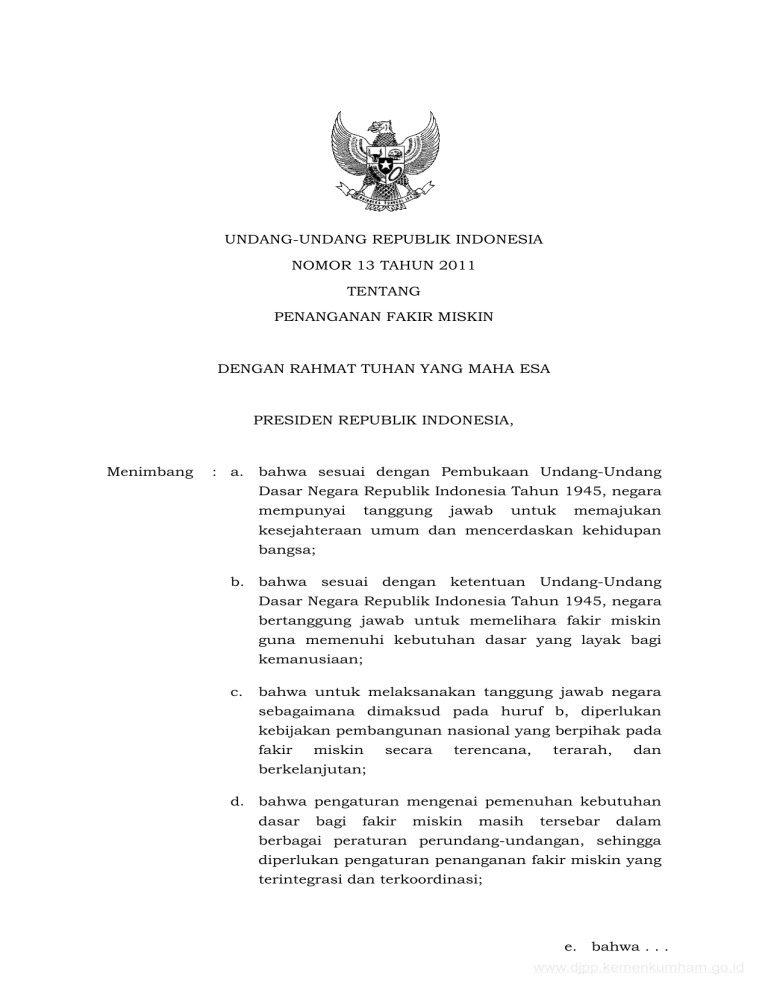 UNDANG-UNDANG REPUBLIK INDONESIA NOMOR 13 TAHUN 2011 TENTANG PENANGANAN FAKIR MISKIN DENGAN RAHMAT TUHAN YANG MAHA ESA PRESIDEN REPUBLIK INDONESIA, Menimbang : a. bahwa sesuai dengan Pembukaan Undang-Undang Dasar Negara Republik Indonesia Tahun 1945, negara mempunyai tanggung jawab untuk memajukan kesejahteraan umum dan mencerdaskan kehidupan bangsa; b. bahwa sesuai dengan ketentuan Undang-Undang Dasar Negara Republik Indonesia Tahun 1945, negara bertanggung jawab untuk memelihara fakir miskin guna memenuhi kebutuhan dasar yang layak bagi kemanusiaan; c. bahwa untuk melaksanakan tanggung jawab negara sebagaimana dimaksud pada huruf b, diperlukan kebijakan pembangunan nasional yang berpihak pada fakir miskin secara terencana, terarah, dan berkelanjutan; d. bahwa pengaturan mengenai pemenuhan kebutuhan dasar bagi fakir miskin masih tersebar dalam berbagai peraturan perundang-undangan, sehingga diperlukan pengaturan penanganan fakir miskin yang terintegrasi dan terkoordinasi; e. bahwa . . . www.djpp.kemenkumham.go.id -2e. Mengingat bahwa berdasarkan pertimbangan sebagaimana dimaksud pada huruf a, huruf b, huruf c, dan huruf d perlu membentuk Undang-Undang tentang Penanganan Fakir Miskin; : 1. Pasal 20, Pasal 21, Pasal 27 ayat (2), Pasal 28H ayat (1) dan ayat (2), Pasal 33 ayat (3) dan ayat (4), dan Pasal 34 ayat (1) Undang-Undang Dasar Negara Republik Indonesia Tahun 1945; 2. Undang-Undang Nomor 11 Tahun 2009 tentang Kesejahteraan Sosial (Lembaran Negara Republik Indonesia Tahun 2009 Nomor 12, Tambahan Lembaran Negara Republik Indonesia Nomor 4967); Dengan Persetujuan Bersama DEWAN PERWAKILAN RAKYAT REPUBLIK INDONESIA dan PRESIDEN REPUBLIK INDONESIA, MEMUTUSKAN: Menetapkan : UNDANG-UNDANG MISKIN. TENTANG PENANGANAN FAKIR BAB I KETENTUAN UMUM Pasal 1 Dalam Undang-Undang ini yang dimaksud dengan: 1. Fakir miskin adalah orang yang sama sekali tidak mempunyai sumber mata pencaharian dan/atau mempunyai sumber mata pencaharian tetapi tidak mempunyai kemampuan memenuhi kebutuhan dasar yang layak bagi kehidupan dirinya dan/atau keluarganya. 2. Penanganan . . . www.djpp.kemenkumham.go.id -32. Penanganan fakir miskin adalah upaya yang terarah, terpadu, dan Pemerintah, berkelanjutan pemerintah yang dilakukan daerah, dan/atau masyarakat dalam bentuk kebijakan, program dan kegiatan pemberdayaan, pendampingan, serta fasilitasi untuk memenuhi kebutuhan dasar setiap warga negara. 3. Kebutuhan sandang, dasar adalah perumahan, kebutuhan kesehatan, pangan, pendidikan, pekerjaan, dan/atau pelayanan sosial. 4. Pemerintah pusat, selanjutnya disebut Pemerintah, adalah Presiden Republik Indonesia yang memegang kekuasaan pemerintahan Negara Republik Indonesia sebagaimana dimaksud dalam Undang-Undang Dasar Negara Republik Indonesia Tahun 1945. 5. Pemerintah daerah adalah Gubernur, Bupati, atau Walikota, dan perangkat daerah sebagai unsur penyelenggara pemerintahan daerah. 6. Menteri adalah menteri yang menyelenggarakan urusan pemerintahan di bidang sosial. Pasal 2 Penanganan fakir miskin berasaskan: a. kemanusiaan; b. keadilan sosial; c. nondiskriminasi; d. kesejahteraan; e. kesetiakawanan; dan f. pemberdayaan. BAB II . . . www.djpp.kemenkumham.go.id -4BAB II HAK DAN TANGGUNG JAWAB Pasal 3 Fakir miskin berhak: a. memperoleh kecukupan pangan, sandang, dan perumahan; b. memperoleh pelayanan kesehatan; c. memperoleh pendidikan yang dapat meningkatkan martabatnya; d. mendapatkan perlindungan sosial dalam membangun, mengembangkan, dan memberdayakan diri dan keluarganya sesuai dengan karakter melalui jaminan budayanya; e. mendapatkan pelayanan sosial sosial, pemberdayaan sosial, dan rehabilitasi sosial dalam membangun, mengembangkan, serta memberdayakan diri dan keluarganya; f. memperoleh derajat kehidupan yang layak; g. memperoleh lingkungan hidup yang sehat; h. meningkatkan kondisi kesejahteraan yang berkesinambungan; dan i. memperoleh pekerjaan dan kesempatan berusaha. Pasal 4 Fakir miskin bertanggung jawab: a. menjaga diri dan keluarganya dari perbuatan yang dapat merusak kesehatan, kehidupan sosial, dan ekonominya; b. meningkatkan . . . www.djpp.kemenkumham.go.id -5b. meningkatkan kepedulian dalam bermasyarakat; c. memberdayakan dirinya dan agar ketahanan sosial mandiri dan meningkatkan taraf kesejahteraan serta berpartisipasi dalam upaya penanganan kemiskinan; dan d. berusaha dan bekerja sesuai dengan kemampuan bagi yang mempunyai potensi. BAB III PENANGANAN FAKIR MISKIN Bagian Kesatu Umum Pasal 5 Penanganan fakir miskin dilaksanakan secara terarah, terpadu, dan berkelanjutan oleh Pemerintah, pemerintah daerah, dan masyarakat. Pasal 6 Sasaran penanganan fakir miskin ditujukan kepada: a. perseorangan; b. keluarga; c. kelompok; dan/atau d. masyarakat. Pasal 7 (1) Penanganan fakir miskin dilaksanakan dalam bentuk: a. pengembangan . . . www.djpp.kemenkumham.go.id -6a. pengembangan potensi diri; b. bantuan pangan dan sandang; c. penyediaan pelayanan perumahan; d. penyediaan pelayanan kesehatan; e. penyediaan pelayanan pendidikan; f. penyediaan akses kesempatan kerja dan berusaha; g. bantuan hukum; dan/atau h. pelayanan sosial. (2) Penanganan fakir miskin sebagaimana dimaksud pada ayat (1) dapat dilakukan melalui: a. pemberdayaan kelembagaan masyarakat; b. peningkatan kapasitas mengembangkan fakir kemampuan miskin dasar untuk dan kemampuan berusaha; c. jaminan dan perlindungan sosial untuk memberikan rasa aman bagi fakir miskin; d. kemitraan dan kerja sama antarpemangku kepentingan; dan/atau e. koordinasi antara kementerian/lembaga dan pemerintah daerah. Bagian Kedua Pendataan Fakir Miskin Pasal 8 (1) Menteri menetapkan kriteria fakir miskin sebagai dasar untuk melaksanakan penanganan fakir miskin. (2) Dalam . . . www.djpp.kemenkumham.go.id -7(2) Dalam menetapkan kriteria sebagaimana dimaksud pada ayat (1), Menteri berkoordinasi dengan kementerian dan lembaga terkait. (3) Kriteria sebagaimana dimaksud pada ayat (1) menjadi dasar bagi lembaga yang menyelenggarakan urusan pemerintahan di bidang kegiatan statistik untuk mela