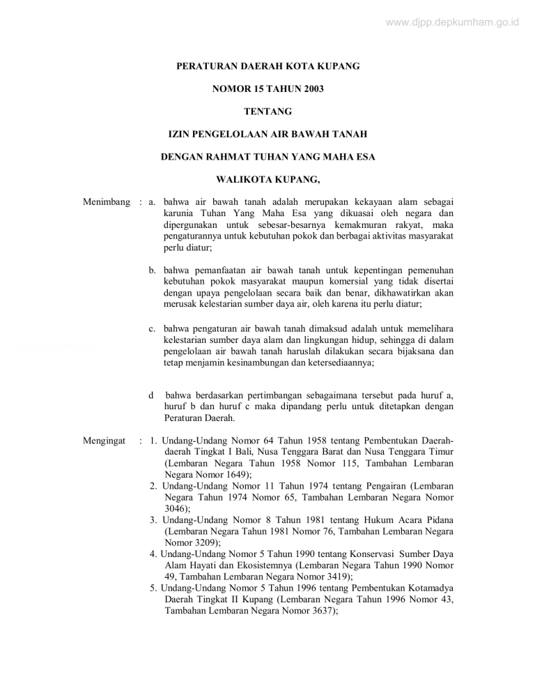 www.djpp.depkumham.go.id PERATURAN DAERAH KOTA KUPANG NOMOR 15 TAHUN 2003 TENTANG IZIN PENGELOLAAN AIR BAWAH TANAH DENGAN RAHMAT TUHAN YANG MAHA ESA WALIKOTA KUPANG, Menimbang : a. bahwa air bawah tanah adalah merupakan kekayaan alam sebagai karunia Tuhan Yang Maha Esa yang dikuasai oleh negara dan dipergunakan untuk sebesar-besarnya kemakmuran rakyat, maka pengaturannya untuk kebutuhan pokok dan berbagai aktivitas masyarakat perlu diatur; b. bahwa pemanfaatan air bawah tanah untuk kepentingan pemenuhan kebutuhan pokok masyarakat maupun komersial yang tidak disertai dengan upaya pengelolaan secara baik dan benar, dikhawatirkan akan merusak kelestarian sumber daya air, oleh karena itu perlu diatur; www.djpp.depkumham.go.id c. bahwa pengaturan air bawah tanah dimaksud adalah untuk memelihara kelestarian sumber daya alam dan lingkungan hidup, sehingga di dalam pengelolaan air bawah tanah haruslah dilakukan secara bijaksana dan tetap menjamin kesinambungan dan ketersediaannya; d Mengingat bahwa berdasarkan pertimbangan sebagaimana tersebut pada huruf a, huruf b dan huruf c maka dipandang perlu untuk ditetapkan dengan Peraturan Daerah. : 1. Undang-Undang Nomor 64 Tahun 1958 tentang Pembentukan Daerahdaerah Tingkat I Bali, Nusa Tenggara Barat dan Nusa Tenggara Timur (Lembaran Negara Tahun 1958 Nomor 115, Tambahan Lembaran Negara Nomor 1649); 2. Undang-Undang Nomor 11 Tahun 1974 tentang Pengairan (Lembaran Negara Tahun 1974 Nomor 65, Tambahan Lembaran Negara Nomor 3046); 3. Undang-Undang Nomor 8 Tahun 1981 tentang Hukum Acara Pidana (Lembaran Negara Tahun 1981 Nomor 76, Tambahan Lembaran Negara Nomor 3209); 4. Undang-Undang Nomor 5 Tahun 1990 tentang Konservasi Sumber Daya Alam Hayati dan Ekosistemnya (Lembaran Negara Tahun 1990 Nomor 49, Tambahan Lembaran Negara Nomor 3419); 5. Undang-Undang Nomor 5 Tahun 1996 tentang Pembentukan Kotamadya Daerah Tingkat II Kupang (Lembaran Negara Tahun 1996 Nomor 43, Tambahan Lembaran Negara Nomor 3637); www.djpp.depkumham.go.id www.djpp.depkumham.go.id 6. Undang-Undang Nomor 23 Tahun 1997 tentang Pengelolaan Lingkungan Hidup (Lembaran Negara Tahun 1997 Nomor 68, Tambahan Lembaran Negara Nomor 3699); 7. Undang-Undang Nomor 22 Tahun 1999 tentang Pemerintah Daerah (Lembaran Negara Tahun 1999 Nomor 60, Tambahan Lembaran Negara Nomor 3839); 8. Undang-Undang Nomor 22 Tahun 1982 tentang Tata Pengaturan Air (Lembaran Negara Tahun 1982 Nomor 37, Tambahan Lembaran Negara Nomor 3225); 9. Undang-Undang Nomor 27 Tahun 1999 tentang Analisis Mengenai Dampak Lingkungan (Lembaran Negara Tahun 1999 Nomor 59, Tambahan Lembaran Negara Nomor 3838); 10. Undang-Undang Nomor 25 Tahun 2000 tentang Kewenangan Pemerintah dan Kewenangan Propinsi sebagai Daerah Otonom (Lembaran Negara Tahun 2000 Nomor 54, Tambahan Lembaran Negara Nomor 3952); 11. Undang-Undang Nomor 66 Tahun 2001 tentang Retribusi Daerah (Lembaran Negara Tahun 2001 Nomor 119, Tambahan Lembaran Negara Nomor 4139); 12. Peraturan Pemerintah Nomor 82 Tahun 2001 tentang Pengelolaan Kualitas Air dan Pengendalian Pencemaran Air (Lembaran Negara Tahun 2001 Nomor 153, Tambahan Lembaran Negara Nomor 4161); 13. Keputusan Presiden Republik Indonesia Nomor 64 Tahun 1972 tentang Pengaturan, Pengurusan dan Penguasaan Uap Geotermal Sumber Air Bawah Tanah dan Mata Air Panas; 14. Peraturan Menteri Pertambangan dan Energi Nomor 03/P/M/Pertambangan/1983 tentang Pengelolaan Air Bawah Tanah; 15. Keputusan Menteri Energi dan Sumber Daya Mineral Nomor 1451.K/10/MEM/2000 tentang Pedoman Teknis Penyelenggaraan Tugas Pemerintahan di Bidang Pengelolaan Air Bawah Tanah; 16. Keputusan Menteri Dalam Negeri Nomor 21 Tahun 2001 tentang Penyusunan dan Materi Muatan Produk-produk Hukum Daerah; 17. Keputusan Menteri Dalam Negeri Nomor 22 Tahun 2001 tentang Bentuk Produk-produk Hukum Daerah; 18. Keputusan Menteri Dalam Negeri Nomor 23 Tahun 2001 tentang Prosedur Penyusunan Produk Hukum Daerah; 19. Keputusan Menteri Dalam Negeri Nomor 24 Tahun 2001 tentang Lembaran Daerah dan Berita Daerah; 20. Keputusan Menteri Dalam Negeri 130-67 Tahun 2002 tentang Pengakuan Kewenangan Kabupaten dan Kota; 21. Keputusan Menteri Negara Lingkungan Hidup Nomor 86 Tahun 2002 Pedoman Pelaksanaan Upaya Pengelolaan Lingkungan Hidup dan Upaya Pemantauan Lingkungan Hidup; 22. Peraturan Daerah Kota Kupang Nomor 3 Tahun 2001 tentang Penyidik Pegawai Negeri Sipil (Lembaran Daerah Kota Kupang Tahun 2001 Nomor 29, Tambahan Lembaran Daerah Nomor 77); 23. Peraturan Daerah Kota Kupang Nomor 39 Tahun 2002 tentang Pembentukan Organisasi dan Tata Kerja Dinas Pertambangan dan Energi Kota Kupang (Lembaran Daerah Kota Kupang Tahun 2002 Nomor 52, Tambahan Lembaran Daerah Nomor 125); www.djpp.depkumham.go.id 24. Peraturan Daerah Kota Kupang Nomor 51 Tahun 2002 tentang Pembentukan Organisasi dan Tata Kerja Kantor Satuan Polisi Pamong Praja Kota Kupang (Lembaran Daerah Kota Kupang Tahun 2002 Nomor 64, Tambahan Lembaran Daerah Nomor 137). Dengan persetujuan DEWAN PERWAKILAN RAKYAT DAERAH KOTA KUPANG MEMUTUSKAN: Menetapkan : PERATURAN DAERAH KOTA KUPANG PENGELOLAAN AIR BAWAH TANAH TENTANG IZIN BAB I KETENTUAN UMUM Pasal 1 Dalam Peraturan Daerah ini yang dimaksud dengan: 1. Daerah adalah Kota Kupang; 2. Pemerintah Daerah adalah Kepala Daerah beserta Perangkat Daerah Otonom lainnya sebagai badan eksekutif daerah; 3. Walikota adalah Walikota Kupang; www.djpp.depkumham.go.id 4. Dinas Pertambangan dan Energi adalah Dinas Pertambangan dan Energi Kota Kupang; 5. Kepala Dinas Pertambangan dan Energi adalah Kepala Dinas Pertambangan dan Energi Kota Kupang; 6. Badan Pengendalian Dampak Lingkungan adalah Badan Pengendalian Dampak Lingkungan Kota Kupang; 7. Kepala Badan Pengendalian Dampak Lingkungan adalah Kepala Badan Pengendalian Dampak Lingkungan Kota Kupang; 8. Kantor Satuan Polisi Pamong Praja adalah Kantor Satuan Polisi Pamong Praja Kota Kupang; 9 Kepala Kantor Satuan Polisi Pamong Praja adalah Kepala Kantor Satuan Polisi Pamong Praja Kota Kupang; 10. Penyidik Pegawai Negeri Sipil yang selanjutnya disebut 