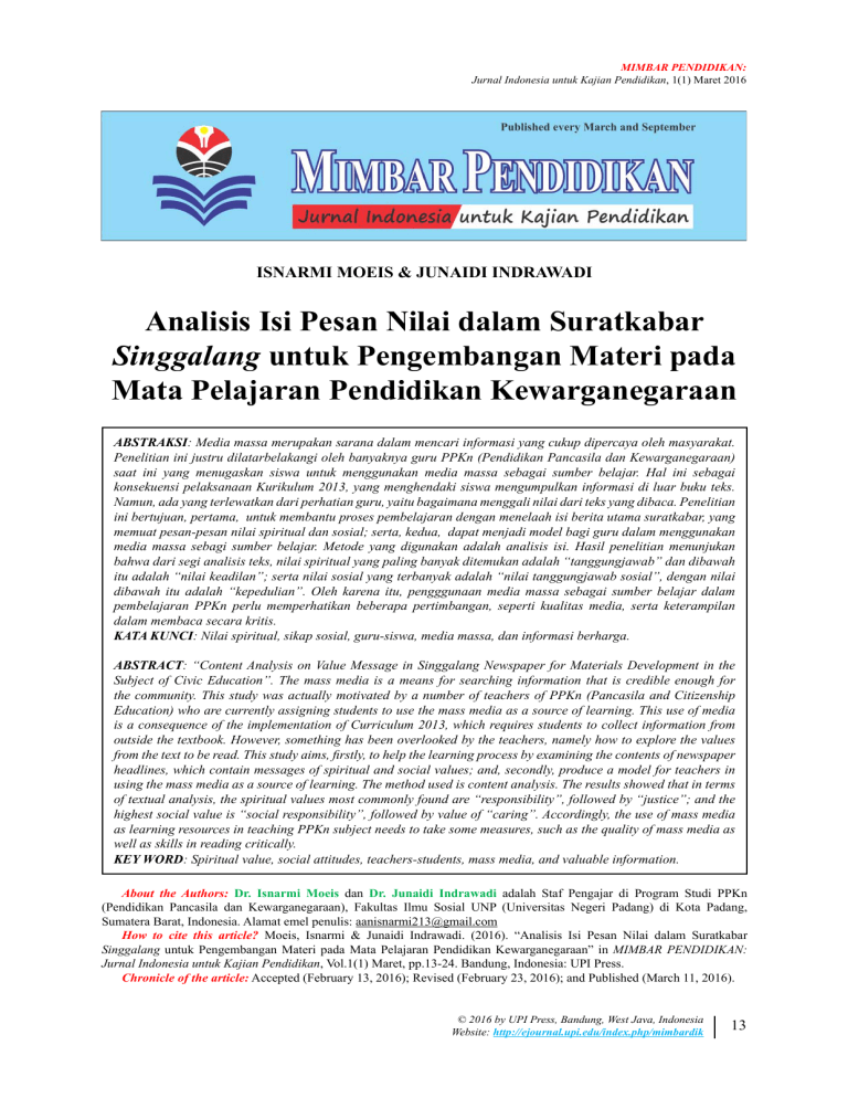 MIMBAR PENDIDIKAN: Jurnal Indonesia untuk Kajian Pendidikan, 1(1) Maret 2016 ISNARMI MOEIS & JUNAIDI INDRAWADI Analisis Isi Pesan Nilai dalam Suratkabar Singgalang untuk Pengembangan Materi pada Mata Pelajaran Pendidikan Kewarganegaraan ABSTRAKSI: Media massa merupakan sarana dalam mencari informasi yang cukup dipercaya oleh masyarakat. Penelitian ini justru dilatarbelakangi oleh banyaknya guru PPKn (Pendidikan Pancasila dan Kewarganegaraan) saat ini yang menugaskan siswa untuk menggunakan media massa sebagai sumber belajar. Hal ini sebagai konsekuensi pelaksanaan Kurikulum 2013, yang menghendaki siswa mengumpulkan informasi di luar buku teks. Namun, ada yang terlewatkan dari perhatian guru, yaitu bagaimana menggali nilai dari teks yang dibaca. Penelitian ini bertujuan, pertama, untuk membantu proses pembelajaran dengan menelaah isi berita utama suratkabar, yang memuat pesan-pesan nilai spiritual dan sosial; serta, kedua, dapat menjadi model bagi guru dalam menggunakan media massa sebagi sumber belajar. Metode yang digunakan adalah analisis isi. Hasil penelitian menunjukan bahwa dari segi analisis teks, nilai spiritual yang paling banyak ditemukan adalah “tanggungjawab” dan dibawah itu adalah “nilai keadilan”; serta nilai sosial yang terbanyak adalah “nilai tanggungjawab sosial”, dengan nilai dibawah itu adalah “kepedulian”. Oleh karena itu, pengggunaan media massa sebagai sumber belajar dalam pembelajaran PPKn perlu memperhatikan beberapa pertimbangan, seperti kualitas media, serta keterampilan dalam membaca secara kritis. KATA KUNCI: Nilai spiritual, sikap sosial, guru-siswa, media massa, dan informasi berharga. ABSTRACT: “Content Analysis on Value Message in Singgalang Newspaper for Materials Development in the Subject of Civic Education”. The mass media is a means for searching information that is credible enough for the community. This study was actually motivated by a number of teachers of PPKn (Pancasila and Citizenship Education) who are currently assigning students to use the mass media as a source of learning. This use of media is a consequence of the implementation of Curriculum 2013, which requires students to collect information from outside the textbook. However, something has been overlooked by the teachers, namely how to explore the values from the text to be read. This study aims, firstly, to help the learning process by examining the contents of newspaper headlines, which contain messages of spiritual and social values; and, secondly, produce a model for teachers in using the mass media as a source of learning. The method used is content analysis. The results showed that in terms of textual analysis, the spiritual values most commonly found are “responsibility”, followed by “justice”; and the highest social value is “social responsibility”, followed by value of “caring”. Accordingly, the use of mass media as learning resources in teaching PPKn subject needs to take some measures, such as the quality of mass media as well as skills in reading critically. KEY WORD: Spiritual value, social attitudes, teachers-students, mass media, and valuable information. About the Authors: Dr. Isnarmi Moeis dan Dr. Junaidi Indrawadi adalah Staf Pengajar di Program Studi PPKn (Pendidikan Pancasila dan Kewarganegaraan), Fakultas Ilmu Sosial UNP (Universitas Negeri Padang) di Kota Padang, Sumatera Barat, Indonesia. Alamat emel penulis: aanisnarmi213@gmail.com How to cite this article? Moeis, Isnarmi & Junaidi Indrawadi. (2016). “Analisis Isi Pesan Nilai dalam Suratkabar Singgalang untuk Pengembangan Materi pada Mata Pelajaran Pendidikan Kewarganegaraan” in MIMBAR PENDIDIKAN: Jurnal Indonesia untuk Kajian Pendidikan, Vol.1(1) Maret, pp.13-24. Bandung, Indonesia: UPI Press. Chronicle of the article: Accepted (February 13, 2016); Revised (February 23, 2016); and Published (March 11, 2016). © 2016 by UPI Press, Bandung, West Java, Indonesia Website: http://ejournal.upi.edu/index.php/mimbardik 13 ISNARMI MOEIS & JUNAIDI INDRAWADI, Analisis Isi Pesan Nilai dalam Suratkabar Singgalang PENDAHULUAN Media massa merupakan sarana mencari informasi yang cukup dipercaya bagi masyarakat. Hasil satu survey di Amerika Serikat, yang dikutip oleh seorang penulis, Wahyu Desy N. (2011), di www.tribuntimur.com, pada tanggal 23 september 2011, menyatakan bahwa 72% masyarakat menyatakan percaya dengan berita di media massa (Desy N., 2011). Orang yang mengikuti perkembangan berita setiap hari menyatakan lebih percaya kepada media massa daripada pemerintah. Di Indonesia, sebagaimana dikutip lebih jauh, menunjukan bahwa masyarakat lebh percaya kepada media massa daripada pemerintah. Penelitian lain oleh Guafon Wan & Diane Gut (2008) juga menemukan bahwa remaja di Cina dan di Amerika Serikat menggunakan waktu yang banyak dalam penggunaan media. Media memainkan peran penting dalam kehidupan remaja di Cina dan Amerika Serikat (Wan & Gut, 2008). Fenomena ini juga terjadi di sekolah kita hari ini. Kebanyakan guru PPKn (Pendidikan Pancasila dan Kewarganegaraan), terutama yang berada di daerah perkotaan, tidak asing lagi memberikan tugas kepada siswa untuk mencari sumber bacaan di luar buku teks. Ini disebabkan oleh tuntutan Kurikulum 2013, yang mengharuskan siswa menggali informasi sebagai salah satu langkah dari pembelajaran dengan pendekatan saintifik. Implikasinya, guru mengarahkan siswa untuk mencari sumber belajar melalui internet dan koran. Penekananan pada aspek sikap dalam Kurikulum 2013 menjadi bagian penting, terutama untuk mata pelajaran PPKn, karena prinsip dasar dalam mata pelajaran ini adalah pembentukan karakter warga negara yang baik. Diantara sumber yang digunakan selain buku teks yang diwajibkan, juga siswa diarahkan untuk mengumpulkan bahanbahan bacaan dari internet dan suratkabar. Penggunaan sumber dari media itu lebih banyak dipakai guru sebagai tambahan informasi bagi pembahasan topik tertentu dalam pembelajaran. 14 © 2016 by UPI Press, Bandung, West Java, Ind