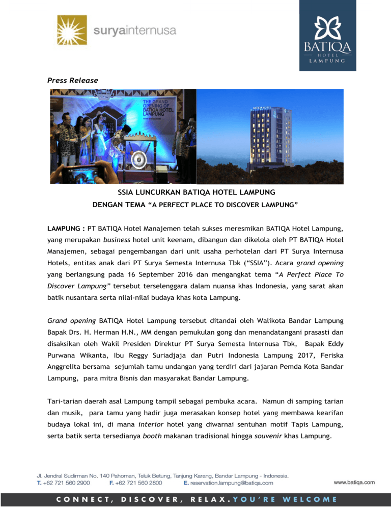 Press Release SSIA LUNCURKAN BATIQA HOTEL LAMPUNG DENGAN TEMA “A PERFECT PLACE TO DISCOVER LAMPUNG” LAMPUNG : PT BATIQA Hotel Manajemen telah sukses meresmikan BATIQA Hotel Lampung, yang merupakan business hotel unit keenam, dibangun dan dikelola oleh PT BATIQA Hotel Manajemen, sebagai pengembangan dari unit usaha perhotelan dari PT Surya Internusa Hotels, entitas anak dari PT Surya Semesta Internusa Tbk (“SSIA”). Acara grand opening yang berlangsung pada 16 September 2016 dan mengangkat tema “A Perfect Place To Discover Lampung” tersebut terselenggara dalam nuansa khas Indonesia, yang sarat akan batik nusantara serta nilai-nilai budaya khas kota Lampung. Grand opening BATIQA Hotel Lampung tersebut ditandai oleh Walikota Bandar Lampung Bapak Drs. H. Herman H.N., MM dengan pemukulan gong dan menandatangani prasasti dan disaksikan oleh Wakil Presiden Direktur PT Surya Semesta Internusa Tbk, Bapak Eddy Purwana Wikanta, Ibu Reggy Suriadjaja dan Putri Indonesia Lampung 2017, Feriska Anggrelita bersama sejumlah tamu undangan yang terdiri dari jajaran Pemda Kota Bandar Lampung, para mitra Bisnis dan masyarakat Bandar Lampung. Tari-tarian daerah asal Lampung tampil sebagai pembuka acara. Namun di samping tarian dan musik, para tamu yang hadir juga merasakan konsep hotel yang membawa kearifan budaya lokal ini, di mana interior hotel yang diwarnai sentuhan motif Tapis Lampung, serta batik serta tersedianya booth makanan tradisional hingga souvenir khas Lampung. “Nuansa seperti ini dipercaya akan memberikan kesan bahwa BATIQA Hotel Lampung hadir di “Kota Tapis Berseri” yang siap melayani para tamu yang tengah melakukan perjalanan bisnis maupun wisata”, tukas Adhi Wahyu, selaku General Manager BATIQA Hotel Lampung. BATIQA Hotel Lampung telah bekerjasama dengan Usaha Kecil Menengah ternama di Lampung, seperti; produsen jajanan oleh-oleh khas Lampung, Yussy Akmal dan Pempek Nony, Keripik Shinta; produsen biji kopi Ulu Belu Coffee, pengrajin batik Batik Gabovira. Di samping itu BATIQA Hotel Lampung juga bekerjasama dengan Express Air dan Lion Group (Lion Air & Wings Air) serta beberapa perusahaan tour & travel untuk mendukung program wisata di Provinsi Lampung. Dalam rangka grand opening, manajemen BATIQA Hotel Lampung telah melaksanakan kegiatan CSR (Corporate Social Responsibility) pada tanggal 9 September 2016 yaitu menyumbang sejumlah buku yang ditujukan kepada para pelajar SD dan kegiatan Donor Darah bersama Palang Merah Indonesia yang diikuti oleh seluruh jajaran manajemen dan staff hotel, para tamu, hingga masyarakat yang tinggal di sekitar hotel. General Manager BATIQA Hotel Lampung, Adhi Wahyu Prasetyo menyampaikan bahwa hotel BATIQA Hotel Lampung memiliki 108 kamar yang terdiri atas 98 kamar tipe Superior dan 10 kamar tipe Suite, selain itu hotel bintang tiga tersebut juga dilengkapi oleh berbagai fasilitas pendukung seperti empat meeting room, FRESQA Bistro, private dining room, sarana fitness, 24 hours room service, high speed Wifi, TV cable. Di samping itu Bapak Michael Tjahaja selaku Wakil Presiden Direktur PT Surya Internusa Hotels mengungkapkan bahwa BATIQA Hotels akan memasuki market dengan mencari lokasi strategis berpotensi bisnis, di kota-kota besar maupun di wilayah second tier yang ada di Indonesia. Strategi pengembangan yang dijalankan yaitu melakukan acquisition ataupun lease terhadap lahan yang berpotensi untuk dibangun hotel, serta bekerjasama dengan mitra bisnis dan investor untuk bersama-sama mengembangkan bisnis perhotelan yang menawarkan: joint venture, long term lease dan managed properties atau menawarkan hotel management services. Dengan mengusung tema “A Perfect Place to Discover Lampung” maka ingin menyampaikan pesan khusus dalam grand opening ini yaitu kehadiran BATIQA Hotel Lampung akan menjadi pilihan yang tepat bagi para wisatawan dan pebisnis yang sekalian singgah ke kota Lampung tidak hanya untuk bisnis, melainkan berdarmawisata melihat keindaham alam, dengan layanan staff yang informatif, serta shuttle bagi para tamu. Konsep tersebut dituangkan kedalam gambar tiga jenis objek pariwisata yang sayang jika dilewatkan ketika para pelancong tiba di Lampung. Ketiga objek pariwisata tersebut adalah air terjun Waylalaan, Gunung Krakatau, dan Pantai Mutun. BATIQA Hotel Lampung berlokasi strategis, tepatnya di Jalan Jenderal Sudirman No. 140 Pahoman, dan hanya berjarak kurang lebih 0,4 km dari Stadion Pahoman serta dekat juga dengan pusat perbelanjaan, wisata, dan kuliner. BATIQA Hotel Lampung memiliki 108 kamar yang terdiri dari 98 kamar tipe Superior (23 m2), dan 10 kamar tipe Suites (48 m2). Selain itu BATIQA Hotel Lampung juga dilengkapi dengan berbagai fasilitas pendukung seperti lounge, empat modular meeting room, FRESQA Bistro (indoor dan outdoor), 1 Private Dining Room, Gym, 24 jam room service, high speed Wi-Fi, serta TV cable. PT BATIQA Hotel Manajemen yang mengembangkan BATIQA Hotels telah memiliki 6 (enam) hotel hingga tahun 2016 yang terdiri dari: - BATIQA Hotel & Apartments Karawang sebanyak 137 kamar (diresmikan pada 18 September 2014) - BATIQA Hotel Cirebon sebanyak 108 kamar (diresmikan pada 9 September 2015) - BATIQA Hotel Jababeka sebanyak 127 kamar (diresmikan pada 11 November 2015) - BATIQA Hotel Palembang sebanyak 160 kamar (diresmikan pada 18 Februari 2016) - BATIQA Hotel Pekanbaru sebanyak 133 kamar (diresmikan pada 26 Agustus 2016) - BATIQA Hotel Lampung sebanyak 108 kamar (diresmikan pada 16 September 2016) BATIQA Hotels berencana akan terus berekspansi dengan mendirikan hotel-hotel yang tersebar di berbagai kota di seluruh Indonesia. Sekilas Tentang BATIQA Hotels BATIQA Hotels merupakan jaringan hotel bintang tiga di Indonesia, dengan visi yang sangat tegas yaitu untuk menjadi perusahaan jaringan manajemen perhotelan terbesar, terpercaya, dan yang diakui se-Asia Tenggara. BATIQA Hotels berkeinginan untuk menciptakan nilai yang tinggi untuk seluruh stakeholders dengan cara menciptakan pelayanan yang sangat baik yang didas