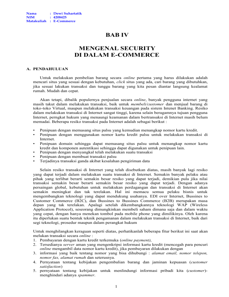 Nama : Dewi Suhartatik NIM : 4208425 Matakuliah : E-Commerce BAB IV MENGENAL SECURITY DI DALAM E-COMMERCE A. PENDAHULUAN Untuk melakukan pembelian barang secara online pertama yang harus dilakukan adalah mencari situs yang sesuai dengan kebutuhan, click situs yang ada, cari barang yang dibutuhkan, jika sesuai lakukan transaksi dan tunggu barang yang kita pesan diantar langsung kealamat rumah. Mudah dan cepat. Akan tetapi, dibalik populernya penjualan secara online, banyak pengguna internet yang masih takut dalam melakukan transaksi, baik untuk membeli/customer dan menjual barang di toko-toko Virtual, maupun melakukan transaksi keuangan pada sistem Intenet Banking. Resiko dalam melakukan transaksi di Internet sangat tinggi, karena selain beragamnya tujuan pengguna Internet, perngkat hukum yang menaungi keamanan dalam bertransaksi di Internet masih belum memadai. Beberapa resiko transaksi pada Internet adalah sebagai berikut : • • • • • • Penipuan dengan memasang situs palsu yang kemudian menangkap nomor kartu kredit. Penipuan dengan menggunakan nomor kartu kredit palsu untuk melakukan transaksi di Internet. Penipuan domain sehingga dapat memasang situs palsu untuk menangkap nomor kartu kredit dan komponen autentikasi sehingga dapat digunakan untuk penipuan lain. Penipuan dengan menyangkal telah melakukan suatu transaksi Penipuan dengan membuat transaksi palsu Terjadinya transaksi ganda akibat kesalahan pengiriman data Selain resiko transaksi di Internet yang telah disebutkan diatas, masih banyak lagi resiko yang dapat terjadi dalam melakukan suatu transaksi di Internet. Semakin banyak pelaku atau pihak yang terlibat berarti semakin besar resiko yang dapat terjadi, demikian pula jika nilai transaksi semakin besar berarti semakin besar resiko yang dapat terjadi. Dengan adanya persaingan global, kebutuhan untuk melakukan perdagangan dan transaksi di Internet akan semakin meningkat dan tak terelakan. Hal ini memacu semua pelaku bisnis untuk mengembangkan teknologi yang dapat mendukung usahanya. EDI over Internet, Bussines to Customer Commerce (B2C), dan Bussines to Bussines Commerce (B2B) merupakan masa depan yang tak terelakan. Apalagi setelah dikembangkannya teknologi WAP (Wireless Application Protocol), seseorang dimungkinkan membeli saham dimana saja dan dalam waktu yang cepat, dengan hanya menekan tombol pada mobile phone yang dimilikinya. Oleh karena itu diperlukan suatu bentuk teknik pengamanan dalam melakukan transaksi di Internet, baik dari segi teknologi, prosedur maupun dalam perangkat hukum Untuk menghilangkan keraguan seperti diatas, perhatikanlah beberapa fitur berikut ini saat akan melukan transaksi secara online : 1. Pembayaran dengan kartu kredit terkemuka (online payment), 2. Tersedianya server aman yang mengenkripsi informasi kartu kredit (mencegah para pencuri online mengambil data nomor kartu kredit), jika pembayaran dilakukan dengan 3. informasi yang baik tentang nomor yang bisa dihubungi : alamat email, nomor telepon, nomor fax, alamat rumah dan seterusnya. 4. Pernyataan tentang kebijakan pengembalian barang dan jaminan kepuasan (customer satisfaction) 5. pernyataan tentang kebijakan untuk menlindungi informasi pribadi kita (customer)menghindari adanya spammer. 1 Nama : Dewi Suhartatik NIM : 4208425 Matakuliah : E-Commerce 2 6. Adanya keterangan bahwa barang yang kita pesan tersedia dan bisa secepatnya dikirim. B. SEKURITAS/KEAMANAN DI E-COMMERCE Dalam prakteknya, berbelanja di web memerlukan koneksi ke internet dan browser yang mendukung transaksi elektronik yang aman, seperti Microsoft Internet Explorer dan Netscape Navigator. Microsoft dan Netscape, bekerja sama dengan perusahaan kartu kredit (Visa dan MasterCard), serta perusahaan-perusahaan internet security (seperti VeriSign), telah membuat standar enkripsi khusus yang membuat transaksi melalui web menjadi sangat aman. Bahkan, Visa dan MasterCard menyediakan jaminan keamanan 100% kepada pengguna credit cardnya yang menggunakan e-com. Yang menandakan suatu retailer web site aman atau tidak adalah adanya tanda khusus yang muncul di status bar di bagian bawah layar browser. Pada IE (Internet Explorer), tanda yang muncul adalah tanda gembok terkunci di pojok kanan status bar. Sedangkan pengguna Netscape Navigator, akan melihat tanda kunci di pojok kiri status bar. Jika tanda-tanda tersebut muncul, berarti Anda sedang ter-connect pada server yang aman. Walaupun begitu, karena standar yang dipakai untuk secure connection ini relatif baru, belum semua cybershop menggunakan standar ini. Kumpulan dari banyak cybershop yang telah terintegrasi dinamakan cybermall. Beberapa cybermall akan mengecek terlebih dahulu legitimasi dari cybershop yang akan masuk, sehingga dapat menghindari adanya cybershop yang palsu. Beberapa cybermall juga menyediakan jasajasa tambahan, seperti billing atau tagihan yang tersentralisasi, menjadikan proses belanja menjadi lebih mudah dan aman. e-Commerce yang menggunakan prosedur sistem keamanan dan teknik-teknik untuk menghadapi segala resiko yang terjadi. Fungsi-fungsi umumnya antara lain: Authentication (Pembuktian keaslian) Confidentiality (kerahasiaan) Data integrity (integritas data) Biasanya semua itu diimplementasikan dengan menggunakan teknologi kriptografi seperti enkripsi dan digital signature. KONSEP DASAR KEAMANAN e-Commerce Tujuan-tujuan Sistem Keamanan Informasi: Confidentially : Menjamin apakah informasi yang dikirim tersebut tidak dapat dibuka atau tidak dapat diketahui oleh orang lain yang tidak berhak. Integrity : Menjamin konsistensi data tersebut apakah masih utuh sesuai aslinya atau tidak, sehingga upaya orang-orang yang tidak bertanggung jawab untuk melakukan penduplikatan dan perusakan data bisa dihindari. Availability : Menjamin pengguna yang sah agar dapat mengakses informasi dan sumber miliknya sendiri. Legitimate Use : Menjamin kepastian bahwa sumber tidak digunakan oleh orangorang yang tidak bertanggung jawab. Sistem Keamanan Informasi : Merupakan penerapan te
