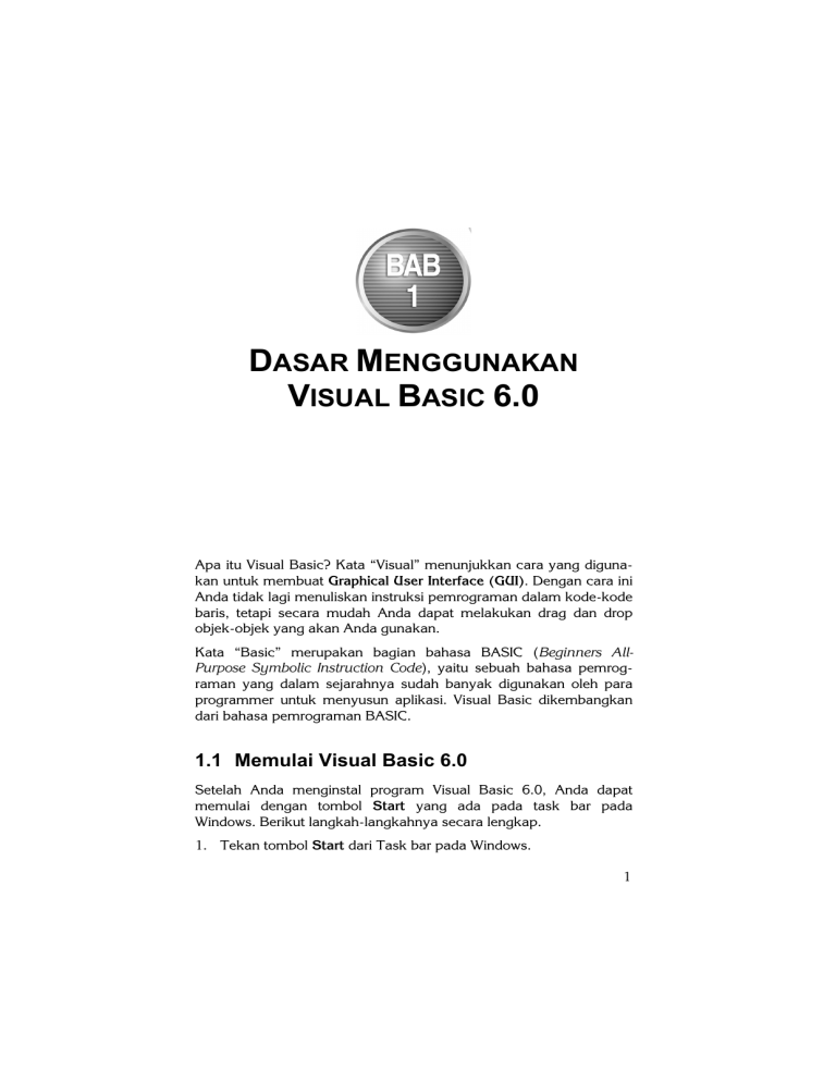 DASAR MENGGUNAKAN VISUAL BASIC 6.0 Apa itu Visual Basic? Kata “Visual” menunjukkan cara yang digunakan untuk membuat Graphical User Interface (GUI). Dengan cara ini Anda tidak lagi menuliskan instruksi pemrograman dalam kode-kode baris, tetapi secara mudah Anda dapat melakukan drag dan drop objek-objek yang akan Anda gunakan. Kata “Basic” merupakan bagian bahasa BASIC (Beginners AllPurpose Symbolic Instruction Code), yaitu sebuah bahasa pemrograman yang dalam sejarahnya sudah banyak digunakan oleh para programmer untuk menyusun aplikasi. Visual Basic dikembangkan dari bahasa pemrograman BASIC. 1.1 Memulai Visual Basic 6.0 Setelah Anda menginstal program Visual Basic 6.0, Anda dapat memulai dengan tombol Start yang ada pada task bar pada Windows. Berikut langkah-langkahnya secara lengkap. 1. Tekan tombol Start dari Task bar pada Windows. 1 2. Pilih All Programs, dan arahkan ke pilihan Microsoft Visual Studio 6.0 dan klik pada pilihan Microsoft Visual Basic 6.0. Gambar 1.1 Membuka Program Visual Basic 6.0 3. Setelah Anda berhasil menjalankan Visual Basic untuk yang pertama kalinya, Anda akan melihat tampilan logo Visual Basic 6.0 dan tak lama kemudian akan muncul kotak dialog berikut. Gambar 1.2 Kotak Dialog New Project 4. Kotak dialog tersebut meminta konfirmasi kepada Anda untuk memilih tipe proyek yang ingin Anda buat. Dalam hal ini, pilih tipe proyek VB Enterprise Edition Constrols. Tekan tombol Open untuk melanjutkan. 2 Gambar 1.3 Kotak Dialog Pemilihan Tipe Proyek 5. Dengan pemilihan tipe VB Enterprise Edition Controls di atas, seorang pengguna tidak perlu lagi capek-capek menambahkan komponen-komponen yang diperlukan. Hal itu karena pada tipe proyek tersebut sudah menyediakan komponen-komponen secara lengkap. Tekan tombol Open untuk melanjutkan. 6. Setelah menekan tombol Open, akan muncul sebuah layar program Visual Basic dengan disertai komponen-komponen lengkap yang ada pada bagian General atau Toolbox. Gambar 1.4 Tampilan Interface Visual Basic 3 7. Tampilan di atas dapat disebut dengan lingkungan Integrated Development Environment (IDE). Pada lingkungan tersebut, Anda dapat melakukan berbagai aktivitas seperti proses editing, compiling, dan debugging. 1.2 Mengenal Elemen Visual Basic 6.0 Setelah Anda berhasil membuka Visual Basic pada layar, Anda akan menemukan interface program Visual Basic seperti Gambar 1.4. Terlihat bahwa interface tersebut terdiri atas beberapa elemen. 1.2.1 Menu Bar Menu Bar akan menampilkan perintah-perintah yang dapat Anda gunakan saat Anda bekerja pada Visual Basic. Secara default, menu bar ini memiliki pilihan File, Edit, View, Window, Query, Diagram, Tools, Add-Ins, dan Help. Disamping itu, sehubungan dengan pemrograman, terdapat menu yang bisa diakses, misalnya Project, Format, Debug, atau Run. Gambar 1.5 Tampilan Menu Bar Jika masing-masing menu bar tersebut diklik, Visual Basic akan menampilkan daftar pilihan dari menu bar yang Anda klik tadi. 1.2.2 Context Menu Context Menu berisi shortcut yang suatu saat bisa Anda gunakan untuk membuka sebuah context menu suatu objek. Untuk membuka Context Menu ini, Anda dapat mengklik kanan objek yang akan Anda buka Context Menu-nya. Berikut tampilan gambarnya. 4 Gambar 1.6 Tampilan Context Menu Context Menu di atas, kami ambilkan dari Designer Form, yaitu dengan cara mengklik kanan Form Designer. 1.2.3 Toolbar Fasilitas ini dapat mempercepat pengaksesan perintah-perintah yang ada dalam pemrograman. Anda dapat mengklik tombol-tombol dalam toolbar ini untuk melakukan aksi tertentu. Secara standar, toolbar jenis Standard yang akan ditampilkan saat Anda memulai Visual Basic. Jika Anda ingin mengatur tampilan toolbar yang lain, Anda dapat menggunakan pilihan Toolbar pada menu bar View. Gambar 1.7 Tampilan Toolbar 1.2.4 Toolbox Sebuah window yang berisi tombol-tombol control yang akan Anda gunakan untuk mendesain atau “Membangun” sebuah form atau report. Selain tombol control di bawah, Anda juga dapat mendefinisikan atau menambah sendiri tombol control yang lain. 5 Gambar 1.8 Tampilan Toolbox Tipe Standard Gambar 1.9 Tampilan Toolbox Tipe VB Enterprise Edition Controls Tampil tidaknya window ini dapat Anda atur dari pilihan Toolbox yang ada pada menu bar View Æ Toolbox. 1.2.5 Window Project Explorer Window Project Explorer ini menampilkan daftar form, modul, serta objek lain yang ada dalam project yang aktif. Sebuah Project merupakan sekumpulan file yang Anda gunakan untuk membangun sebuah aplikasi. Berikut tampilan gambarnya. 6 Gambar 1.10 Tampilan Window Project Explorer 1.2.6 Window Properties Window Properties ini dapat Anda gunakan untuk mengatur propertie sebuah objek atau control yang Anda pilih. Sebuah property merupakan karakteristik objek, seperti size, caption, text, atau color. Gambar 1.11 Tampilan Window Properties 7 1.2.7 Objek Browser Objek Browser ini merupakan daftar objek yang ada dalam project yang aktif. Anda dapat menggunakan Object Browser untuk menampilkan objek yang ada dalam Visual Basic dan aplikasi lain. Untuk menampilkan objek ini Anda dapat menggunakan cara View Æ Object Browser. Berikut tampilan gambarnya. Gambar 1.12 Tampilan Object Browser 1.2.8 Form Designer Form Designer adalah sebuah window yang dapat Anda gunakan untuk mengatur tampilan aplikasi yang Anda susun, atau dengan kata lain sebagai tempat untuk mendesain sebuah form. Dalam form ini Anda dapat menambahkan control, grafik, dan gambar ke dalam form pada posisi yang Anda inginkan. Setiap form memiliki window designer form sendiri-sendiri. Berikut tampilan gambarnya. Gambar 1.13 Tampilan Form Designer 8 1.2.9 Window Code Editor Window Code Editor merupakan sebuah tampilan window yang digunakan untuk memasukkan kode aplikasi. Window Code Editor ini digunakan untuk mendefinisikan kode-kode form atau kode modul dalam sebuah aplikasi. Berikut tampilan gambarnya. Gambar 1.14 Tampilan Window Code Editor 1.2.10 Window Form Layout Window Form Layout dapat digunakan untuk mengontrol posisi form pada aplikasi Anda mengguna