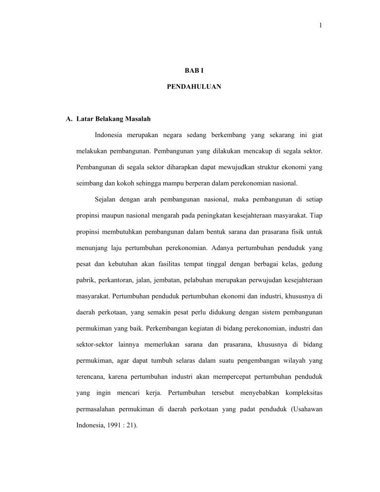 1 BAB I PENDAHULUAN A. Latar Belakang Masalah Indonesia merupakan negara sedang berkembang yang sekarang ini giat melakukan pembangunan. Pembangunan yang dilakukan mencakup di segala sektor. Pembangunan di segala sektor diharapkan dapat mewujudkan struktur ekonomi yang seimbang dan kokoh sehingga mampu berperan dalam perekonomian nasional. Sejalan dengan arah pembangunan nasional, maka pembangunan di setiap propinsi maupun nasional mengarah pada peningkatan kesejahteraan masyarakat. Tiap propinsi membutuhkan pembangunan dalam bentuk sarana dan prasarana fisik untuk menunjang laju pertumbuhan perekonomian. Adanya pertumbuhan penduduk yang pesat dan kebutuhan akan fasilitas tempat tinggal dengan berbagai kelas, gedung pabrik, perkantoran, jalan, jembatan, pelabuhan merupakan perwujudan kesejahteraan masyarakat. Pertumbuhan penduduk pertumbuhan ekonomi dan industri, khususnya di daerah perkotaan, yang semakin pesat perlu didukung dengan sistem pembangunan permukiman yang baik. Perkembangan kegiatan di bidang perekonomian, industri dan sektor-sektor lainnya memerlukan sarana dan prasarana, khususnya di bidang permukiman, agar dapat tumbuh selaras dalam suatu pengembangan wilayah yang terencana, karena pertumbuhan industri akan mempercepat pertumbuhan penduduk yang ingin mencari kerja. Pertumbuhan tersebut menyebabkan kompleksitas permasalahan permukiman di daerah perkotaan yang padat penduduk (Usahawan Indonesia, 1991 : 21). 2 Untuk mengatasi permasalahan permukiman maka dibutuhkan suatu investasi yang dapat memenuhi kebutuhan masyarakat akan permukiman dan sarana prasarana. Investasi merupakan salah satu upaya pemerintah untuk mendorong pertumbuhan ekonomi. Investasi yang berhubungan dengan kebutuhan tersebut adalah investor sektor properti. Investasi properti yang teratur sangat diperlukan untuk meningkatkan nilai investasi di sektor properti, akan tetapi hal tersebut sulit terpenuhi karena adanya jeda waktu antara investasi yang dilakukan dengan terwujudnya nilai tambah produk properti. Dalam melakukan investasi di sektor properti membutuhkan waktu yang lama untuk mendapatkan nilai tambah produk properti, maka para pengembang atau para pengusaha properti terlebih dahulu melakukan estimasi secara cermat agar para pengembang bisa mendapatkan nilai tambah produk dan keuntungan yang lebih tinggi. Keuntungan yang tinggi akan mendorong para investor untuk melakukan investasi. Untuk mendapatkan nilai tambah dan keuntungan yang tinggi investasi sektor properti juga membutuhkan dana yang tidak sedikit. Dana yang dibutuhkan dalam melakukan investasi properti banyak, karena sektor ini merupakan sektor yang padat modal, sehingga para pengembang atau para pengusaha memerlukan bantuan kredit bank untuk menjalankan usaha, dengan adanya kredit dari bank maka besar kecilnya bunga secara otomatis mempengaruhi keinginan kalangan pengembang properti untuk melakukan investasi di bidang ini. Suku bunga yang tinggi akan menghambat investasi properti karena para pengembang yang meminjam dana akan dikenakan biaya bunga yang tinggi sehingga para pengembang berfikir terlebih dahulu sebelum melakukan ivnestasi, dengan biaya bunga yang tinggi itu para pengembang dapat mendapatkan keuntungan yang lebih untuk menutup biaya bunga apa tidak, jika keuntungan dapat 3 menutup kerugian biaya bunga maka para pengembang bisa melakukan investasi tetapi apabila biaya bunga lebih tinggi dari keuntungan maka para pengembang tidak melakukan investasi. Selain berpengaruh terhadap para pengembang tingkat suku bunga juga dapat mempengaruhi konsumen, khususnya konsumen perumahan yang tidak mempunyai dana yang cukup dan mengharapkan bantuan kredit dari bank untuk membeli rumah tersebut. Suku bunga yang tinggi akan menyebabkan para kreditur tidak bisa membayar pinjaman sehingga menyebabkan kredit macet. Akibat yang disebabkan dengan adanya kredit macet maka banyak pengangguran para pekerja akibat perusahaan yang tidak mampu mengembalikan kredit kepada bank, selain itu banyak bank yang mengalami kerugian yang besar sehingga banyak bank yang dinyatakan pailit. Apabila banyak terdapat kasus seperti ini, secara umum akan memperburuk perekonomian (Dorn Busch, 1989 : 97). Apabila keadaan perekonomian memburuk maka inflasi akan semakin tinggi dan investasi properti akan terpengaruh. Di bidang properti ini perkembangan indikator moneter seperti inflasi, deflasi dan tingkat suku bunga akan mempengaruhi prospek pendanaan dan penerimaan investasi di bidang properti (Sri Mulyani, 1996 : 110). Perkembangan inflasi Jawa Tengah mengalami fluktuasi, inflasi mengalami penurunan ditahun tertentu dan mengalami kenaikan yang tinggi ditahun berikutnya keadaan ini menyebabkan investasi kurang berjalan lancar, hal ini dapat dilihat tingkat inflasi Jawa Tengah per sektor pada tahun 1996 – 2001. Seperti dalam tabel berikut ini 4 Tabel 1.1 : Tingkat Inflasi Jawa Tengah Tahun 1996 – 2001 (dalam persen) Tahun Bahan Makana Perum Makana n Jadi ahan Sandang Kesehat Pendidik Transp an an ort Umum n 1996 2,42 - 4,85 2,52 6,91 - - 4,37 1997 16,49 9,87 7,26 5,69 2,38 13,88 4,26 9,55 1998 137,54 76,15 28,50 90,08 65,03 31,36 43,55 67,1 1999 -6,57 2,18 6,05 0,51 1,39 13,94 6,38 1,51 2000 2,53 10,07 11,24 12,13 5,96 13,27 13,27 8,73 2001 6,77 5,95 6,73 5,12 6,28 2,17 2,17 5,93 Sumber : BPS Jawa Tengah Tingkat inflasi dapat memperburuk tingkat investasi tetapi tingkat inflasi disatu pihak, memang menguntungkan bagi sektor properti. Diakui bahwa tanah dan bangunan merupakan sasaran yang menarik dalam keadaan inflasi untuk melindungi diri dari penurunan nilai riil finansial. Namun demikian, inflasi yang tinggi menurunkan nilai riil pendapatan dan kekayaan masyarakat sehingga mengurangi daya belinya untuk membeli atau menyewa properti. Sektor properti merupakan sektor yang paling padat modal dan memerlukan pendanaan yang cukup besar dalam jangka panjang. Depresiasi juga ikut menentukan, karena faktor dalam nergeri kurang mampu menyediakan dana yang diperlukan, sehingga pinja