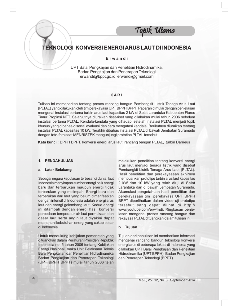 Topik Utama TEKNOLOGI KONVERSI ENERGI ARUS LAUT DI INDONESIA Erwandi UPT Balai Pengkajian dan Penelitian Hidrodinamika, Badan Pengkajian dan Penerapan Teknologi erwandi@bppt.go.id, erwandi@gmail.com SARI Tulisan ini memaparkan tentang proses rancang bangun Pembangkit Listrik Tenaga Arus Laut (PLTAL) yang dilakukan oleh tim perekayasa UPT BPPH BPPT. Paparan dimulai dengan penjelasan mengenai instalasi pertama turbin arus laut kapasitas 2 kW di Selat Larantuka Kabupaten Flores Timur Propinsi NTT. Selanjutnya diuraikan riset-riset yang dilakukan mulai tahun 2006 sebelum instalasi pertama PLTAL. Kendala-kendala yang dihadapi setelah instalasi PLTAL menjadi topik khusus yang dibahas disertai evaluasi dan cara mengatasi kendala. Berikutnya diuraikan tentang instalasi PLTAL kapasitas 10 kW. Terakhir dibahas instalasi PLTAL di bawah Jembatan Suramadu dengan foto-foto saat MENRISTEK mengunjungi prototipe PLTAL tersebut. Kata kunci : BPPH BPPT, konversi energi arus laut, rancang bangun PLTAL, turbin Darrieus 1. PENDAHULUAN a. Latar Belakang Sebagai negara kepulauan terbesar di dunia, laut Indonesia menyimpan sumber energi baik energi baru dan terbarukan maupun energi tidak terbarukan yang melimpah. Energi baru dan terbarukan dari laut yang belum dimanfaatkan dengan intensif di Indonesia adalah energi arus laut dan energi gelombang laut. Kedua energi ini ditambah dengan energi hasil konversi perbedaan temperatur air laut permukaan dan dasar laut serta angin laut diyakini dapat memenuhi kebutuhan energi yang cukup besar di Indonesia. Untuk mendukung kebijakan pemerintah yang dituangkan dalam Peraturan Presiden Republik Indonesia no. 5 tahun 2006 tentang Kebijakan Energi Nasional, maka Unit Pelaksana Teknis Balai Pengkajian dan Penelitian Hidrodinamika Badan Pengkajian dan Penerapan Teknologi (UPT BPPH BPPT) mulai tahun 2006 telah 4 melakukan penelitian tentang konversi energi arus laut menjadi tenaga listrik yang disebut Pembangkit Listrik Tenaga Arus Laut (PLTAL). Hasil penelitian dan perekayasaan akhirnya membuahkan prototipe turbin arus laut kapasitas 2 kW dan 10 kW yang telah diuji di Selat Larantuka dan di bawah Jembatan Suramadu. Akumulasi pengetahuan hasil penelitian dan perekayasaan tim perekayasa UPT BPPH BPPT diperlihatkan dalam video uji prototipe tersebut yang dapat dilihat di http:// www.youtube.com/erw4ndi. Ringkasan penjelasan mengenai proses rancang bangun dan rekayasa PLTAL dituangkan dalam tulisan ini. b. Tujuan Tujuan dari penulisan ini memberikan informasi mengenai rancang bangun teknologi konversi energi arus di beberapa lokasi di Indonesia yang dilakukan UPT Balai Pengkajian dan Penelitian Hidrodinamika (UPT BPPH), Badan Pengkajian dan Penerapan Teknologi (BPPT) M&E, Vol. 12, No. 3, September 2014 Topik Utama 2. RANCANG BANGUN DAN REKAYASA PLTAL VERSI 1.0 KAPASITAS 2 KW Matahari tersaput mendung tipis dan masih sedepa di atas puncak Gunung Mandiri pada siang hari menjelang sore tanggal 27 Maret 2010. Gunung Mandiri yang terkenal dengan sebutan Ile Mandiri dalam bahasa lokal, terletak di sebelah barat Kota Larantuka (Gambar 1). Dari Pulau Adonara gunung tersebut tampak anggun saat proses pemasangan rumah Pembangkit Listrik Tenaga Arus Laut (PLTAL) rampung. Itu adalah proses pemasangan turbin PLTAL yang dikemudian hari diberi nama turbin PLTAL versi 1.0. Turbin dengan kapasitas 2 kilowatt tersebut dijangkar di Selat Larantuka. Selat selebar kurang lebih 700 meter itu memisahkan Pulau Flores dan Pulau Adonara. Dari pantai depan desa Tanah Merah Adonara Barat Flores Timur, posisi PLTAL sekitar 100 meter ke arah laut. Seperti tayangan pada video proses pemasangan dan uji coba pertama kali PLTAL versi 1.0 yang diunggah di http:// www.youtube.com/erw4ndi, penduduk desa Tanah Merah sangat antusias saat PLTAL pertama kali diuji coba (Gambar 2). Rumah PLTAL yang berdiri di atas 2 buah ponton, dengan Gambar 1. Rumah PLTAL 100 meter dari pantai Adonara dengan latar belakang Ile Mandiri berat total 8 ton itu sempat miring tiap kali orang-orang bergerak ke kanan-kiri dek. Sorak kegembiraan pecah saat arus laut mulai muncul memutar turbin dan mulai menghasilkan listrik. Pada kecepatan arus 0,9 m/s turbin PLTAL menghasilkan daya fluktuatif sebesar 600 - 800 Watt. Pada kecepatan 1.7 m/s daya maksimum listrik yang diproduksi PLTAL mencapai 1900 Watt. Saat itu untuk pertama kalinya di Indonesia dapat dibuktikan bahwa listrik dapat dihasilkan dari arus laut. Kecepatan arus laut menyimpan energi kinetik yang dapat dikonversi menjadi tenaga listrik. Turbin yang digunakan untuk menangkap energi kinetik tersebut dapat berupa turbin sumbu horizontal yang persis seperti turbin angin maupun turbin sumbu vertikal yang cara kerjanya seperti mixer pengaduk adonan kue (Gambar 3). Studi pemilihan teknologi turbin pemanen energi kinetik arus laut telah dilakukan di UPT BPPH BPPT sejak tahun 2006. Di UPT yang terletak di kompleks kampus ITS Sukolilo Surabaya itu telah dilakukan pemetaan potensi energi kinetik arus laut di selat-selat di antara ribuan pulau di Indonesia. Simulasi Gambar 2. Teknologi Konversi Energi Arus Laut di Indonesia ; Erwandi Masyarakat Pulau Adonara antusias dengan PLTAL sebelum dipasang di Selat Larantuka 5 Topik Utama Gambar 3. Kinerja bilah turbin PLTAL versi 1.0 numerik kecepatan arus laut di selat-selat terutama di antara pulau-pulau di propinsi NTB dan NTT membuktikan bahwa potensi praktis (practical resources) energi arus laut mencapai 6000 MW. Khusus untuk Selat Larantuka, simulasi numerik dan survei di sana menunjukkan bahwa kecepatan arus laut di beberapa titik mencapai lebih dari 3,8 m/s. Kecepatan arus tersebut sangat potensial untuk dikonversi menjadi tenaga listrik. Oleh karena itu berdasarkan pertimbangan lokasi, kesiapan infrastruktur, maka Selat Larantuka dipilih sebagai tempat uji prototipe PLTAL BPPT. Memanfaatkan fasilitas tangki uji tarik (towing tank) UPT BPPH, tim perekayasa PLTAL BPPH Gambar 4. Kinerja bilah turbin PLTAL versi 1.0 6 melakukan pengkajian dan peneliti