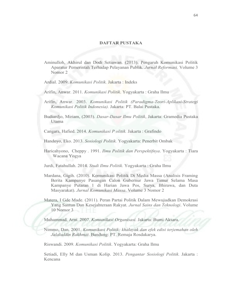 64 DAFTAR PUSTAKA Aminulloh, Akhirul dan Dodi Setiawan. (2013). Pengaruh Komunikasi Politik Aparatur Pemerintah Terhadap Pelayanan Publik. Jurnal Reformasi. Volume 3 Nomor 2 Ardial. 2009. Komunikasi Politik. Jakarta : Indeks Arifin, Anwar. 2011. Komunikasi Politik. Yogyakarta : Graha Ilmu Arifin, Anwar. 2003. Komunikasi Politik (Paradigma-Teori-Aplikasi-Strategi Komunikasi Politik Indonesia). Jakarta: PT. Balai Pustaka. Budiardjo, Miriam, (2003). Dasar-Dasar Ilmu Politik, Jakarta: Gramedia Pustaka Utama Cangara, Hafied. 2014. Komunikasi P olitik. Jakarta : Grafindo Handoyo, Eko. 2013. Sosiologi Politik. Yogyakarta: Penerbit Ombak Haricahyono, Cheppy . 1991. Ilmu Politik dan Perspektifnya. Yogyakarta : Tiara Wacana Yogya Jurdi, Fatahullah. 2014. Studi Ilmu Politik. Yogyakarta : Graha Ilmu Mardana, Gigih. (2010). Komunikasi Politik Di Media Massa (Analisis Framing Berita Kampanye Pasangan Calon Gubernur Jawa Timur Selama Masa Kampanye Putaran 1 di Harian Jawa Pos, Surya, Bhirawa, dan Duta Masyarakat). Jurnal Komunikasi Massa. Volume 3 Nomor 2 Matera, I Gde Made. (2011). Peran Partai Politik Dalam Mewujudkan Demokrasi Yang Santun Dan Kesejahteraan Rakyat. Jurnal Sains dan Teknologi. Volume 10 Nomor 3 Muhammad, Arni. 2007. Komunikasi Organisasi. Jakarta: Bumi Aksara. Nimmo, Dan. 2001. Komunikasi Politik: khalayak dan efek edisi terjemahan oleh Jalaluddin Rakhmat. Bandung: PT. Remaja Rosdakarya. Riswandi. 2009. Komunikasi Politik. Yogyakarta: Graha Ilmu Setiadi, Elly M dan Usman Kolip. 2013. Pengantar Sosiologi Politik. Jakarta : Kencana 65 Setyadarmodjo, Soenarko H. (2000). Organisasi Partai Politik dan Demokrasi. Masyarakat, Kebudayaan dan Politik. Vol 13 Nomor 1 Sitepu, Anthonius P. 2012. Studi Ilmu Politik. Yogyakarta: Graha Ilmu Sugiyono. 2010. Metode Penelitian Pendidikan : Pendekatan Kualitatif dan Kuantitatif. Bandung: Alfabeta, Sulaiman, Adhi Iman. (2013). Komunikasi Politik Dalam Demokratisasi. Observasi. Volume 11 Nomor 2 Supriyatno, Yanto. (2010). Peran Komunikasi Politik Pemerintah Dalam Mencegah Desintegrasi Bangsa. Jurnal Kybernan. Volume 1 Nomor 1 Surbakti, Ramlan. 2010. Memahami Ilmu Politik. Jakarta : Gramedia Visi dan Misi PDI-Perjuangan. (http://PDIPerjuangan.or.id), diakses tanggal : 8 Maret 2016. Online Daftar Wawancara dengan Narasumber Resoalon Lumban Gaol, SE (Ketua DPC PDI-Perjuangan) : Senin, 11 April 2016 pukul 10.00 WIB Lamhot Edward Munthe (Sekretaris DPC PDI-Perjuangan) : Selasa, 12 April 2016 pukul 09.00 WIB Halvensius Tondang (Wakil Ketua Bidang Komunikasi Politik DPC PDIPerjuangan) : Rabu, 13 April 2016 pukul 08.30 WIB Dessy Tobing (Wakil Sekretaris Bidang Eksternal DPC PDI-Perjuangan) Senin, 11 April 2016 pukul 10.00 WIB Bistok Manik (Wakil Sekretaris Bidang Internal DPC PDI-Perjuangan) Selasa, 12 April 2016 pukul 09.00 WIB