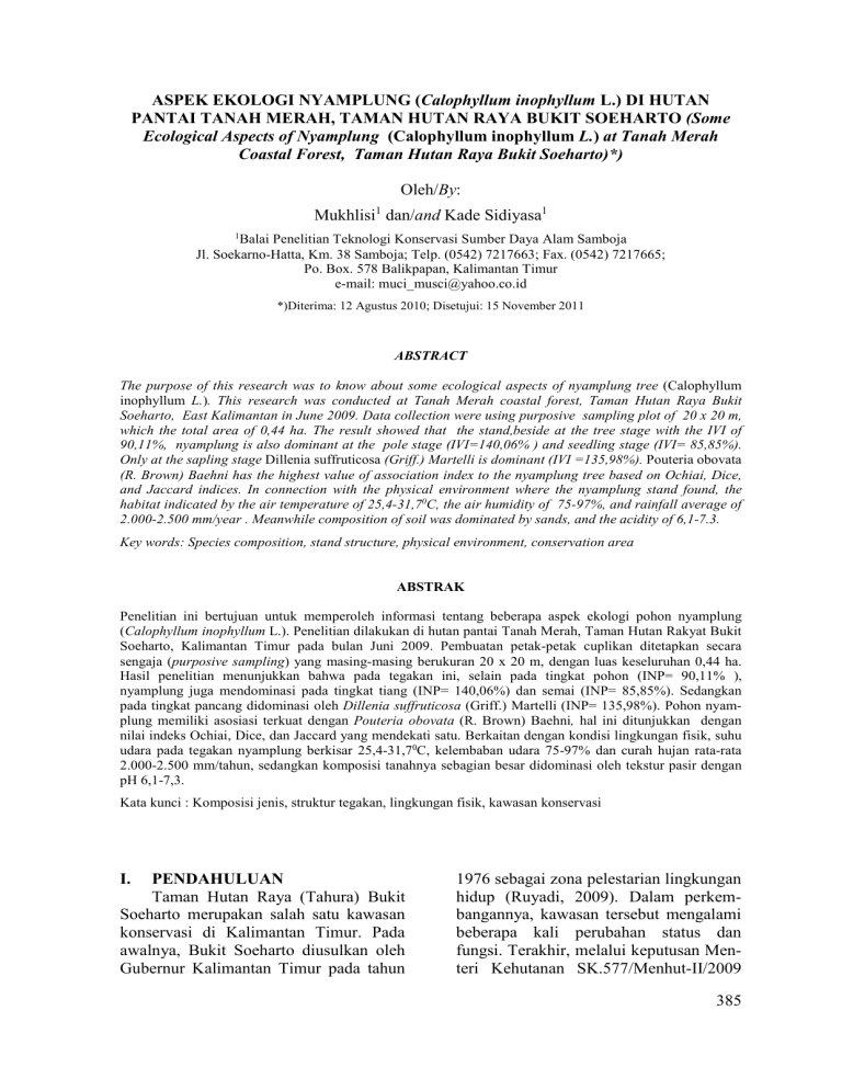 ASPEK EKOLOGI NYAMPLUNG (Calophyllum inophyllum L.) DI HUTAN PANTAI TANAH MERAH, TAMAN HUTAN RAYA BUKIT SOEHARTO (Some Ecological Aspects of Nyamplung (Calophyllum inophyllum L.) at Tanah Merah Coastal Forest, Taman Hutan Raya Bukit Soeharto)*) Oleh/By: Mukhlisi1 dan/and Kade Sidiyasa1 1 Balai Penelitian Teknologi Konservasi Sumber Daya Alam Samboja Jl. Soekarno-Hatta, Km. 38 Samboja; Telp. (0542) 7217663; Fax. (0542) 7217665; Po. Box. 578 Balikpapan, Kalimantan Timur e-mail: muci_musci@yahoo.co.id *)Diterima: 12 Agustus 2010; Disetujui: 15 November 2011 ABSTRACT The purpose of this research was to know about some ecological aspects of nyamplung tree (Calophyllum inophyllum L.). This research was conducted at Tanah Merah coastal forest, Taman Hutan Raya Bukit Soeharto, East Kalimantan in June 2009. Data collection were using purposive sampling plot of 20 x 20 m, which the total area of 0,44 ha. The result showed that the stand,beside at the tree stage with the IVI of 90,11%, nyamplung is also dominant at the pole stage (IVI=140,06% ) and seedling stage (IVI= 85,85%). Only at the sapling stage Dillenia suffruticosa (Griff.) Martelli is dominant (IVI =135,98%). Pouteria obovata (R. Brown) Baehni has the highest value of association index to the nyamplung tree based on Ochiai, Dice, and Jaccard indices. In connection with the physical environment where the nyamplung stand found, the habitat indicated by the air temperature of 25,4-31,70C, the air humidity of 75-97%, and rainfall average of 2.000-2.500 mm/year . Meanwhile composition of soil was dominated by sands, and the acidity of 6,1-7.3. Key words: Species composition, stand structure, physical environment, conservation area ABSTRAK Penelitian ini bertujuan untuk memperoleh informasi tentang beberapa aspek ekologi pohon nyamplung (Calophyllum inophyllum L.). Penelitian dilakukan di hutan pantai Tanah Merah, Taman Hutan Rakyat Bukit Soeharto, Kalimantan Timur pada bulan Juni 2009. Pembuatan petak-petak cuplikan ditetapkan secara sengaja (purposive sampling) yang masing-masing berukuran 20 x 20 m, dengan luas keseluruhan 0,44 ha. Hasil penelitian menunjukkan bahwa pada tegakan ini, selain pada tingkat pohon (INP= 90,11% ), nyamplung juga mendominasi pada tingkat tiang (INP= 140,06%) dan semai (INP= 85,85%). Sedangkan pada tingkat pancang didominasi oleh Dillenia suffruticosa (Griff.) Martelli (INP= 135,98%). Pohon nyamplung memiliki asosiasi terkuat dengan Pouteria obovata (R. Brown) Baehni, hal ini ditunjukkan dengan nilai indeks Ochiai, Dice, dan Jaccard yang mendekati satu. Berkaitan dengan kondisi lingkungan fisik, suhu udara pada tegakan nyamplung berkisar 25,4-31,70C, kelembaban udara 75-97% dan curah hujan rata-rata 2.000-2.500 mm/tahun, sedangkan komposisi tanahnya sebagian besar didominasi oleh tekstur pasir dengan pH 6,1-7,3. Kata kunci : Komposisi jenis, struktur tegakan, lingkungan fisik, kawasan konservasi I. PENDAHULUAN Taman Hutan Raya (Tahura) Bukit Soeharto merupakan salah satu kawasan konservasi di Kalimantan Timur. Pada awalnya, Bukit Soeharto diusulkan oleh Gubernur Kalimantan Timur pada tahun 1976 sebagai zona pelestarian lingkungan hidup (Ruyadi, 2009). Dalam perkembangannya, kawasan tersebut mengalami beberapa kali perubahan status dan fungsi. Terakhir, melalui keputusan Menteri Kehutanan SK.577/Menhut-II/2009 385 Vol. 8 No. 3 : 385-397, 2011 menetapkan Tahura Bukit Soeharto seluas 67.766 ha. Keputusan tersebut sekaligus membatalkan berbagai peraturan yang telah dibuat sebelumnya menyangkut luas definitif kawasan Tahura Bukit Soeharto. Kawasan pantai Tanah Merah merupakan salah satu tipe ekosistem hutan pantai yang dimiliki Tahura Bukit Soeharto. Selama ini, sebagian kawasan pantai Tanah Merah dimanfaatkan sebagai salah satu tujuan wisata alam yang kerap dikunjungi oleh wisatawan lokal terutama pada hari-hari libur. Di samping memiliki pemandangan yang cukup indah, pantai Tanah Merah juga menjadi habitat berbagai jenis tumbuhan pantai, salah satunya adalah pohon nyamplung (Calophyllum inophyllum L.). Nyamplung memiliki habitus berupa pohon yang bertajuk rimbun dengan tinggi mencapai 10-30 m, biasanya tumbuh agak bengkok, condong atau bahkan cenderung mendatar, serta memiliki getah lekat berwarna putih atau kuning ( Noor, et al., 1999). Helaian daun nyamplung berbentuk jorong hingga agak lonjong, atau bundar telur terbalik dengan ujung tumpul, membundar, atau melekuk ke dalam, kaku seperti kulit dan mengkilap. Bunga berkelamin ganda dan berbau harum terletak pada ketiak daun yang teratas. Daun mahkota berwarna putih sebanyak empat helai dan benang sari yang banyak. Bakal buah umumnya berwarna merah, buah berbentuk seperti bola dengan garis tengah mencapai 2,5-3 cm dengan kulit biji yang tebal (Steenis, 1972; Soerianegara dan Lemmens, 1993). Masyarakat memanfaatkan nyamplung sebagai tumbuhan penghasil bahan bakar dan obat-obatan tradisional. Bustomi et al., (2008) melaporkan bahwa biji nyamplung dapat diolah menjadi biodiesel dengan tingkat rendemen yang cukup tinggi (40-73%). Sebagai bahan baku obat, seduhan daun nyamplung berkhasiat sebagai obat pencuci mata yang meradang, rebusan kulit batang digunakan untuk mengobati penyakit keputihan dan 386 rematik, serta bagian biji digunakan untuk mengobati kudis, borok, dan obat penumbuh rambut (Heyne, 1987; Soerianegara dan Lemmens, 1993). Pernah dilaporkan bahwa nyamplung diindikasikan mengandung senyawa yang berkhasiat sebagai anti HIV (Human Immunodeficiency Virus), yaitu inophyllum A-E, inophyllum P, inophyllum G-1, dan inophyllum G-2 (Sulianti et al., 2006). Dalam upaya pelestariaan dan pemanfaatan jenis nyamplung sebagai pohon penghasil minyak nabati (biofuel) dan obat-obatan maka perlu dilakukan pengembangan melalui usaha budidaya. Untuk itu, informasi karakteristik ekologi nyamplung sebagai acuan dalam budidaya sangat diperlukan. Penelitian ini bertujuan untuk memaparkan informasi tentang beberapa aspek ekologi pohon nyamplung sesuai dengan habitatnya di alam. II. B