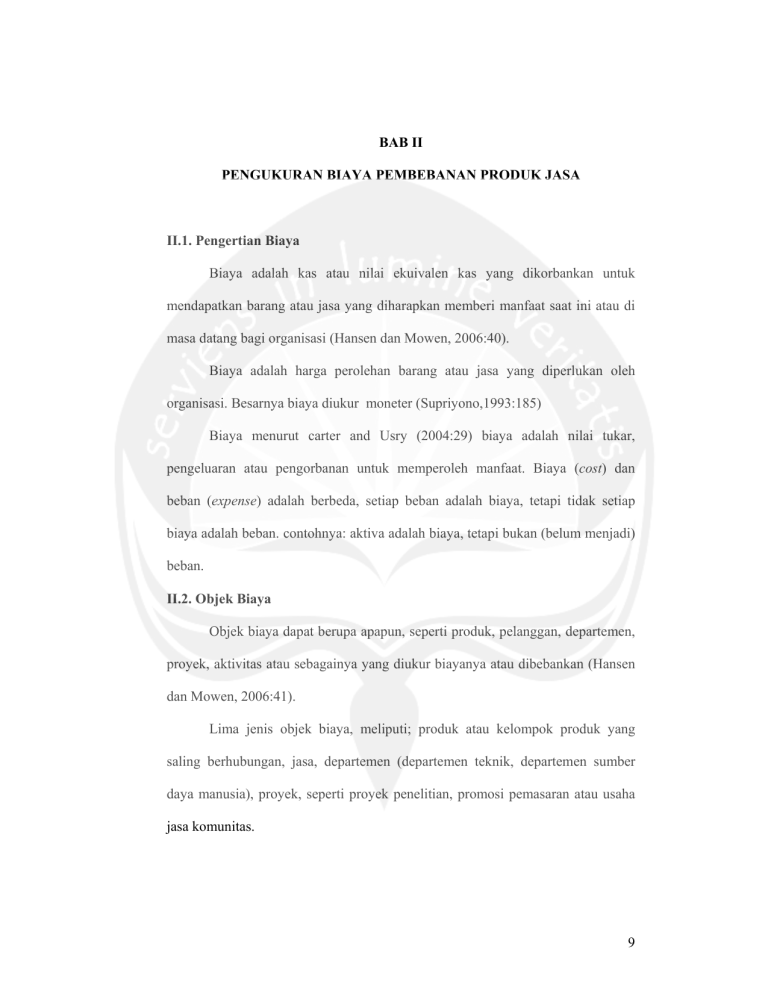 BAB II PENGUKURAN BIAYA PEMBEBANAN PRODUK JASA II.1. Pengertian Biaya Biaya adalah kas atau nilai ekuivalen kas yang dikorbankan untuk mendapatkan barang atau jasa yang diharapkan memberi manfaat saat ini atau di masa datang bagi organisasi (Hansen dan Mowen, 2006:40). Biaya adalah harga perolehan barang atau jasa yang diperlukan oleh organisasi. Besarnya biaya diukur moneter (Supriyono,1993:185) Biaya menurut carter and Usry (2004:29) biaya adalah nilai tukar, pengeluaran atau pengorbanan untuk memperoleh manfaat. Biaya (cost) dan beban (expense) adalah berbeda, setiap beban adalah biaya, tetapi tidak setiap biaya adalah beban. contohnya: aktiva adalah biaya, tetapi bukan (belum menjadi) beban. II.2. Objek Biaya Objek biaya dapat berupa apapun, seperti produk, pelanggan, departemen, proyek, aktivitas atau sebagainya yang diukur biayanya atau dibebankan (Hansen dan Mowen, 2006:41). Lima jenis objek biaya, meliputi; produk atau kelompok produk yang saling berhubungan, jasa, departemen (departemen teknik, departemen sumber daya manusia), proyek, seperti proyek penelitian, promosi pemasaran atau usaha jasa komunitas. 9 Didalam perusahaan, objek atau pusat biaya dapat dihubungkan dengan produk yang dihasilkan, departemen-departemen yang ada dalam pabrik, daerah pemasaran, bagian-bagian dalam organisasi yang lain, atau bahkan individu (Supriyono,1993:209 ). Suatu objek biaya (cost object) atau tujuan biaya (cost objective) didefinisikan sebagai suatu item atau aktivitas yang biayanya diakumulasikan dan diukur (carter and Usry, 2004:30-31). II.3. Penggolongan Biaya Akuntansi biaya bertujuan untuk menyajikan informasi biaya yang akan digunakan untuk berbagai tujuan, dalam menggolongkan biaya harus sesuai dengan tujuan dari informasi yang akan disajikan. Oleh karena itu penggolongan biaya tergantung untuk apa biaya tersebut digolongkan, untuk tujuan yang berbeda diperlukan cara penggolongan yang berbeda pula, atau tidak ada satu cara penggolongan biaya yang dapat dipakai untuk semua tujuan menyajikan informasi biaya. Ada beberapa macam penggolongan biaya yang sering dilakukan adalah sebagai berikut (supriyono,1993) II.3.1. Penggolongan Biaya Sesuai dengan Fungsi Pokok dari Kegiatan / Aktivitas Perusahaan (Cost Classified Accourding to the Fungtion of Bussines Activity) Atas dasar fungsi pokok dari kegiatan perusahaan, biaya dapat digolongkan menjadi: 10 a. Biaya produksi Semua biaya yang berhubungan dengan fungsi produksi atau kegiatan pengolahan bahan baku menjadi produk selesai. Biaya produksi dapat digolongkan ke dalam: 1) Biaya bahan baku: adalah harga perolehan dari bahan baku yang dipakai di dalam pengolahan produk. 2) Biaya tenaga kerja: adalah semua balas jasa yang diberikan oleh perusahaan kepada semua karyawan. 3) Biaya overhead pabrik: adalah biaya produksi selain biaya bahan baku dan biaya tenaga kerja langsung. b. Biaya Pemasaran Biaya dalam rangka penjualan produk selesai sampai dengan pengumpulan piutang menjadi kas. c. Biaya Administrasi dan Umum Semua biaya yang berhubungan dengan fungsi administrasi dan umum. Biaya ini terjadi dalam rangka penentuan kebijaksanaan, pengrahan dan pengawasan kegiatan perusahaan secara keseluruhan. II.3.2. Penggolongan Biaya Sesuai dengan Periode Akuntansi di mana Biaya akan Dibebankan Penggolongan pengeluaran adalah sebagai berikut: a. Pengeluaran Modal (Capital Expenditures) Pengeluaran modal adalah pengeluaran yang akan dapat memberikan manfaat pada beberapa periode akuntansi yang akan datang. 11 Pada saat terjadinya pengeluaran ini dikapitalisasi ke dalam harga perolehan aktiva, dan diperlukan sebagai biaya pada periode akuntansi yang menikmati manfaatnya. b. Pengeluaran Penghasilan (Revenues Expenditures) Pengeluaran penghasilan adalah pengeluaran yang akan memberikan manfaat hanya pada periode akuntansi di mana pengeluaran terjadi. Umumnya pada saat terjadinya pengeluaran langsung diperlakukan ke dalam biaya, atau tidak dikapitalisasi sebagai aktiva. II.3.3. Penggolongan Biaya Sesuai dengan Tendensi Perubahan terhadap Aktivitas atau Kegiatan atau Volume Tendensi perubahan biaya terhadap kegiatan dapat dikelompokkan menjadi: a. Biaya Tetap (Fixed Cost) Biaya tetap mempunyai karakteristik sebagai berikut: 1) Biaya yang jumlah totalnya tetap konstan tidak dipengaruhi oleh perubahan volume kegiatan atau aktivitas sampai dengan tingkatan tertentu. 2) Pada biaya tetap, biaya satuan (unit cost) akan berubah berbanding terbalik dengan perubahan volume kegiatan, semakin tinggi volume kegiatan semakin rendah biaya satuan, semakin rendah volume kegiatan semakin tinggi biaya satuan. b. Biaya Variabel (Variable Cost) Biaya variabel memiliki karakteristik sebagai berikut: 12 1) Biaya yang jumlah totalnya akan berubah secara sebanding (proporsional) dengan peerubahan volume kegiatan, semakin besar volume kegiatan semakin tinggi jumlah total biaya variabel, semakin rendah volume kegiatan semakin rendah jumlah total biaya variabel. 2) Pada biaya variabel, biaya satuan tidak dipengaruhi oleh perubahan volume kegiatan, jadi biaya satuan konstan. c. Biaya Semi Variabel (Semi variable Cost) 1) Biaya yang jumlah totalnya akan berubah sesuai dengan perubahan volume kegiatan, akan tetapi sifat perubahannya tidak sebanding. Semakin tinggi volume kegiatan semakin besar jumlah biaya total, semakin rendah volume kegiatan semakin rendah biaya, tetapi perubahannya tidak sebanding. 2) Pada biaya semi variabel, biaya satuan akan beerubah terbalik dihubungkan dengan perubahan volume kegiatan, tetapi sifatnya tidak sebanding. Sampai dengan tingkatan tertentu semakin tinggi volume kegiatan semakin rendah biaya satuan, semakin rendah volume kegiatan semakin tinggi biaya satuan. II.3.4. Penggolongan Biaya Sesuai dengan Objek atau Pusat Biaya yang Dibiayai Penggolongan biaya sesuai dengan objek biaya mempunyai tujuan untuk: a. Pembebanan biaya kepada setiap objek atau pusat biaya dengan adil dan teliti. b. Pengendalian biaya. c. Pembuatan keputusan. 13 Atas dasar objek biaya atau