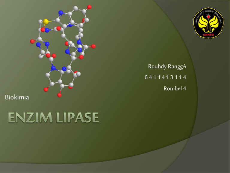 Biokimia Rouhdy RanggA 6411413114 Rombel 4 Enzim adalah golongan protein yang disintesis oleh sel hidup dan mempunyai fungsi penting sebagai katalisator dalam setiap reaksi metabolisme yang terjadi pada organisasi hidup. Enzim juga merupakan biokatalisator yang menunjang berbagai proses industri. Hal ini disebabkan enzim mempunyai efisiensi dan efektifitas yang tinggi, reaksinya tidak menimbulkan produk samping, serta dapat digunakan berulangkali dengan teknik amobilisasi (Lehninger, 1995). Rouhdy Rangga/6411413114 Enzim lipase atau asilgliserol hidrolase adalah kelas turunan dari enzim esterase, yaitu enzim yang mengkatalisis pemecahan lemak menjadi asam lemak dan gliserol. Enzim ini memiliki potensi untuk memproduksi asam lemak, yang merupakan prekursor berbagai industri kimia. Lipase diklasifikasikan sebagai enzim hidrolase yang menghidrolisis trigliserida menjadi asam lemak bebas, gliserida parsial (monogliserida), digliserida dan gliserida. Rouhdy Rangga/6411413114 Mikroorganisme Penghasil Enzim Lipase Kelompok jamur Aspergillus niger dan Penicillium aurantiogriseum. Kelompok bakteri Bacillus, Aeromonas, Pseudomonas, Alcaligenes, Arthrobacter, Chromobacterium, Serratia, Vibrio, Aeromonas, dan Staphyloccus. Rouhdy Rangga/6411413114 Produksi Enzim lipase dari bakteri diawali dengan penanaman bakteri dalam media fermentasi yang terdiri dari komposisi gum arab 5%, pepton 1%, , minyak zaitun 10%. *Dengan kondisi optimum pertumbuhan bakteri sebagai berikut waktu inkubasi 24 jam, suhu 35°C, pH 8. Rouhdy Rangga/6411413114 Proses pemurnian sampel ekstrak kasar enzim lipase diawali dengan fraksinasi bertingkat menggunakan garam ammonium sulfat dengan tingkat kejenuhan (0-20%), (2040%), (40-60%), (60-80%) dan 80-100%), dialsis dan kromatografi kolom. *Enzim lipase hasil pemurnian memiliki karakteristik aktivitas optimum pada pH 8, temperatur 45°C, dan waktu inkubasi 10 menit dengan nilai KM = 0,07 mg substrat/ml dan Vmaks = 1,506 μmol minyak /ml enzim.menit. Rouhdy Rangga/6411413114 Implementasi dan Aplikasi Enzim Lipase Lipase dalam industri susu Lipase dalam deterjen Lipase di industri oleokimia Lipase dalam sintesis trigliserida Lipase dalam sintesis surfaktan Lipase dalam sintesis polimer Lipase di farmasi dan bahan kimia pertanian Rouhdy Rangga/6411413114 Thanks Rouhdy Rangga/6411413114
