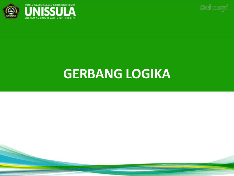 GERBANG LOGIKA KOMPONEN LEVEL GATE 1. Rangkaian Kombinational Rangkaian dimana setiap outputnya hanya merupakan fungsi input pada suatu saat tertentu saja. Komponennya terdiri dari : Logcic Gate (Gerbang Logika) 2. Rangkaian Sequential Rangkaian dimana setiap outputnya tidak hanya tergantung pada input waktu itu saja, tetapi juga pada keadaan input sebelumnya Komponennya terdiri dari : Flip-Flop Logic Gate (Gerbang Logika) • Logic Gate (Gerbang Logika) adalah merupakan dasar pembentuk sistem digital • Logic Gate mempunyai gerbang logika dasar yaitu NOT, AND dan OR. • Dari 3 gerbang logika dasar dibentuk 4 gerbang logika tambahan yaitu NAND, NOR, EX-OR, dan EXNOR Circuit symbol Name X1 AND Truth table Z X2 X1 OR NOT Z X2 X NAND Z X2 X1 NOR EXCLUSIVE -OR Z X2 X1 Z X2 X1 X2 Z 0 0 1 1 0 1 0 1 0 0 0 1 X1 X2 Z 0 0 1 1 0 1 0 1 0 1 1 1 Z X1 Equation X Z 0 0 1 1 10 10 00 01 Z = X1 . X2 Z = X1 + X2 Z= X X1 X2 Z 0 0 1 1 0 1 0 1 1 1 1 0 X1 X2 Z 0 0 1 1 0 1 0 1 1 0 0 0 X1 X2 Z 0 0 1 1 0 1 0 1 0 1 1 0 Z = X1 . X2 Z = X1 + X2 Z = X1 + X2 Perubahan Gerbang Dengan Menggunakan Pembalik GERBANG ASAL 1. AND 2. NAND 3. OR 4. NOR TAMBAH PEMBALIK PADA KELUARAN NOT NOT NOT NOT FUNGSI LOGIKA BARU NAND AND NOR OR TAMBAH PEMBALIK PADA INPUT 1. NOT 2. NOT 3. NOT 4. NOT GERBANG ASAL FUNGSI LOGIKA BARU AND NAND OR NOR NOR OR NAND AND TAMBAH GERBANG PEMBALIK ASAL PADA INPUT 1. NOT 2. NOT 3. NOT 4. NOT AND NAND OR NOR TAMBAH PEMBALIK PADA KELUARAN NOT NOT NOT NOT GERBANG ASAL OR NOR AND NAND