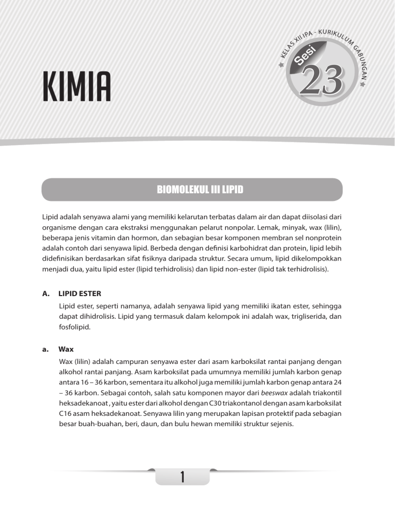 Se 23 BIOMOLEKUL III LIPID Lipid adalah senyawa alami yang memiliki kelarutan terbatas dalam air dan dapat diisolasi dari organisme dengan cara ekstraksi menggunakan pelarut nonpolar. Lemak, minyak, wax (lilin), beberapa jenis vitamin dan hormon, dan sebagian besar komponen membran sel nonprotein adalah contoh dari senyawa lipid. Berbeda dengan definisi karbohidrat dan protein, lipid lebih didefinisikan berdasarkan sifat fisiknya daripada struktur. Secara umum, lipid dikelompokkan menjadi dua, yaitu lipid ester (lipid terhidrolisis) dan lipid non-ester (lipid tak terhidrolisis). A. LIPID ESTER Lipid ester, seperti namanya, adalah senyawa lipid yang memiliki ikatan ester, sehingga dapat dihidrolisis. Lipid yang termasuk dalam kelompok ini adalah wax, trigliserida, dan fosfolipid. a. Wax Wax (lilin) adalah campuran senyawa ester dari asam karboksilat rantai panjang dengan alkohol rantai panjang. Asam karboksilat pada umumnya memiliki jumlah karbon genap antara 16 – 36 karbon, sementara itu alkohol juga memiliki jumlah karbon genap antara 24 – 36 karbon. Sebagai contoh, salah satu komponen mayor dari beeswax adalah triakontil heksadekanoat , yaitu ester dari alkohol dengan C30 triakontanol dengan asam karboksilat C16 asam heksadekanoat. Senyawa lilin yang merupakan lapisan protektif pada sebagian besar buah-buahan, beri, daun, dan bulu hewan memiliki struktur sejenis. 1 GAN KIMIA BUN si AS A - K U RIKUL I IP UM GA KEL XI O || CH3(CH2)14CO(CH2)29CH3 Triakontil heksadekanoat (dari beeswax) (Organic Chemistry Ed. 8, John McMurry, 2012) b. Trigliserida Trigliserida adalah jenis lemak pada hewan dan minyak tumbuhan, yaitu triasilgliserol, triester dari gliserol dengan tiga asam karboksilat rantai panjang yang disebut asam lemak. Hewan menggunakan lemak sebagai penyimpanan energi jangka panjang karena lemak lebih mudah teroksidasi daripada karbohidrat dan menghasilkan energi yang lebih besar. Triasilgliserol atau trigliserida, bentuk ester lemak (Organic Chemistry Ed. 8, John McMurry, 2012) Hidrolisis trigliserida menghasilkan gliserol dan asam lemak bebas. Asam lemak pada umumnya berupa rantai lurus (tidak bercabang) yang mengandung atom karbon dalam jumlah genap antara 12 – 20 karbon. Jika terdapat ikatan rangkap dua, maka sebagian besar merupakan isomer cis-. Ketiga asam lemak pada molekul trigliserida tidak selalu sama. Suatu lemak atau minyak yang berasal dari sebuah sumber dapat merupakan campuran dari berbagai jenis trigliserida. Berikut adalah tabel contoh-contoh dari asam lemak: Name No. of Carbons Melting point(°C) Structure Saturated Lauric 12 43.2 CH3(CH2)10CO2H Myristic 14 53.9 CH3(CH2)12CO2H Palmitic 16 63.1 CH3(CH2)14CO2H 2 Name No. of Carbons Melting point(°C) Structure Stearic 18 68.8 CH3(CH2)16CO2H Arachidic 20 76.5 CH3(CH2)18CO2H Palmitoleic 16 -0.1 (Z)-CH3(CH2)5CH=CH(CH2)7CO2H Oleic 18 13.4 (Z)-CH3(CH2)7CH=CH(CH2)7CO2H Linoleic 18 -12 (Z,Z)-CH3(CH2)4(CH=CHCH2)2(CH2)6CO2H Linolenic 18 -11 (all Z)-CH3CH2(CH=CHCH2)3(CH2)6CO2H Arachidonic 20 -49.5 (all Z)-CH3(CH2)4(CH=CHCH2)4CH2CH2CO2H Unsaturated (Organic Chemistry Ed. 8, John McMurry, 2012) Asam lemak omega-3 berarti terdapat sebuah ikatan rangkap dua pada posisi tiga karbon dari ujung nonkarboksil pada rantai. Contoh asam lemak omega-3 adalah asam linolenat. Asam linolenat, asam lemak tak jenuh omega-3 (Organic Chemistry Ed. 8, John McMurry, 2012) Asam lemak tak jenuh secara umum memiliki titik lebur lebih rendah daripada asam lemak jenuh dengan jumlah karbon yang sama. Minyak nabati memiliki komposisi asam lemak tak jenuh yang lebih besar daripada lemak hewan, sehingga minyak nabati memiliki titik lebur lebih rendah (pada suhu kamar berwujud lebih cair). Hal ini dikarenakan asam lemak jenuh memiliki bentuk yang seragam sehingga dapat menyatu secara lebih efisien dalam bentuk kristal. Pada minyak nabati tak jenuh, adanya ikatan rangkap dua menyebabkan pembengkokan pada rangka karbon, sehingga pembentukan kristal lebih sulit. Semakin banyak ikatan rangkap dua, semakin sulit asam lemak tersebut untuk dikristalkan. 3 Ikatan rangkap dua pada minyak tumbuhan dapat dikurangi melalui reaksi hidrogenasi katalitik, yang dilakukan pada suhu tinggi menggunakan katalis nikel untuk menghasilkan lemak jenuh dengan konsistensi yang lebih tinggi. Mentega dan margarin diproduksi dengan cara menghidrogenasi minyak nabati hingga konsistensi yang diinginkan tercapai. Akan tetapi, proses penjenuhan ini diikuti dengan isomerisasi cis-trans dari ikatan rangkap dua yang tersisa, menghasilkan lemak dengan 10-15% asam lemak tak jenuh trans. Konsumsi asam lemak tak jenuh trans meningkatkan kadar kolesterol darah, yang juga meningkatkan resiko masalah jantung. (Organic Chemistry Ed. 8, John McMurry, 2012) c. Fosfolipid Fosfolipid adalah ester dari asam fosfat, H3PO4. Fosfolipid terdiri dari dua kelompok umum, yaitu gliserofosfolipid dan sfingomielin. Gliserofosfolipid didasarkan pada asam fosfat yang mengandung rangka gliserol yang terikat dengan dua residu asam lemak dan satu asam fosfat. Walaupun residu asam lemak dapat berupa asam lemak dengan 12 – 20 karbon, gugus asil pada C1 pada umumnya adalah asam lemak jenuh dan C2 adalah asam lemak tak jenuh. Gugus fosfat pada C3 juga terikat pada suatu senyawa aminoalkohol seperti kolin, etanolamin, atau serin. Senyawa ini bersifat optis aktif karena memiliki pusat khiral pada C2. (Organic Chemistry Ed. 8, John McMurry, 2012) 4 Sfingomielin adalah grup mayor kedua dari fosfolipid. Senyawa ini memiliki sfingosin atau struktur dihidroksiamin sejenis sebagai rangka utama. Kelompok ini ditemukan dalam jumlah besar di otak dan jaringan saraf, karena merupakan konstituen mayor dari selubung saraf. Fosfolipid ditemukan secara luas pada hewan dan tumbuhan, dan merupakan 50 – 60% komponen membran sel. (Organic Chemistry Ed. 8, John McMurry, 2012) B. LIPID NONESTER Lipid nonester merupakan senyawa alami yang tidak larut air dan tidak terhidrolisis. Senyawa yang termasuk kelompok lipid nonester adalah senyawa 