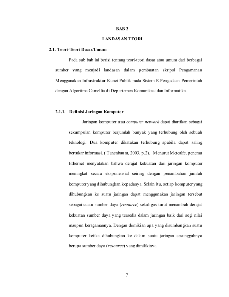 7 BAB 2 LANDAS AN TEORI 2.1. Teori-Teori Dasar/Umum Pada sub bab ini berisi tentang teori-teori dasar atau umum dari berbagai sumber yang menjadi landasan dalam pembuatan skripsi Pengamanan M enggunakan Infrastruktur Kunci Publik pada Sistem E-Pengadaan Pemerintah dengan Algoritma Camellia di Departemen Komunikasi dan Informatika. 2.1.1. Definisi Jaringan Komputer Jaringan komputer atau computer network dapat diartikan sebagai sekumpulan komputer berjumlah banyak yang terhubung oleh sebuah teknologi. Dua komputer dikatakan terhubung apabila dapat saling bertukar informasi. ( Tanenbaum, 2003, p.2). M enurut M etcalfe, penemu Ethernet menyatakan bahwa derajat kekuatan dari jaringan komputer meningkat secara eksponensial seiring dengan penambahan jumlah komputer yang dihubungkan kepadanya. Selain itu, setiap komputer yang dihubungkan ke suatu jaringan dapat menggunakan jaringan tersebut sebagai suatu sumber daya (resource) sekaligus turut menambah derajat kekuatan sumber daya yang tersedia dalam jaringan baik dari segi nilai maupun keragamannya. Dengan demikian apa yang disumbangkan suatu komputer ketika dihubungkan ke dalam suatu jaringan sesungguhnya berupa sumber daya (resource) yang dimilikinya. 7 8 Resource dapat berupa kemampuan memproses, media penyimpanan, informasi, maupun berbagai perangkat pendukung lain seperti printer dan scanner. Berdasarkan luas jangkauan suatu jaringan, maka jaringan dapat dibagi tiga, yaitu Local Area Network (LAN), Metropolitan Area Network (MAN) dan Wide Area Network (WAN) (Tanenbaum 2003, p.16). 2.1.1.1. Local Area Network (LAN) Local Area Network biasa disingkat LAN adalah jaringan komputer yang jaringannya hanya mencakup wilayah kecil, seperti jaringan komputer kampus, gedung, kantor, dalam rumah, sekolah atau yang lebih kecil (Tanenbaum, 2003, p.16). Saat ini, kebanyakan LAN berbasis pada teknologi IEEE 802.3 Ethernet menggunakan perangkat switch, yang mempunyai kecepatan transfer data 10, 100, atau 1000 M bit/s. Selain teknologi Ethernet, saat ini teknologi 802.11b (atau biasa disebut Wi-fi) juga sering digunakan untuk membentuk LAN. Tempat-tempat yang menyediakan koneksi LAN dengan teknologi Wi-fi biasa disebut hotspot. 2.1.1.2. Metropolitan Area Network (MAN) MAN merupakan suatu jaringan dengan jangkauan dari LAN, biasanya terdiri dari dua atau lebih LAN dalam area geografis yang sama(Tanenbaum, 2003, p.18). Penggunaan 9 MAN dapat mencakup perusahaan dengan kantor-kantor cabang di satu kota dan dapat berupa jaringan private atau public. 2.1.1.3. Wide Area Network (WAN) WAN adalah singkatan dari istilah teknologi informasi dalam bahasa Inggris: Wide Area Network merupakan jaringan komputer yang mencakup area yang besar sebagai contoh yaitu jaringan komputer antar wilayah, kota atau bahkan negara. (Tanenbaum, 2003, p.19) 2.1.2. Internet Protocol Internet Protocol adalah mekanisme transmisi data yang digunakan oleh protokol TCP/IP ( Forouzan , 2003, p.389). Berdasarkan pendapat Comer, IP adalah sebuah bilangan biner unik yang diberikan kepada komputer dan digunakan untuk semua komunikasi komputer tersebut( 2004, p.287). 2.1.2.1. IPv4 Alamat IP versi 4 (sering disebut dengan Alamat IPv4) adalah sebuah jenis pengalamatan jaringan yang digunakan di dalam protokol jaringan TCP/IP yang menggunakan protokol IP versi 4. Panjang totalnya adalah 32-bit, dan secara teoritis dapat mengalamati hingga 4 miliar host komputer di seluruh 10 dunia. Contoh alamat IP versi 4 adalah 192.168.0.3. ( Forouzan , 2003, p.389) 2.1.2.2. IPv6 Alamat IP versi 6 (sering disebut sebagai alamat IPv6) adalah sebuah jenis pengalamatan jaringan yang digunakan di dalam protokol jaringan TCP/IP yang menggunakan protokol IP versi 6. Panjang totalnya adalah 128-bit, dan secara teoritis dapat mengalamati hingga 2128=3,4 x 1038 host komputer di seluruh dunia. Contoh alamat IP versi 6 adalah 21DA:00D3:0000:2F3B:02AA:00FF:FE28:9C5A. 2.1.3. Keamanan Jaringan Keamanan jaringan didefinisikan sebagai sebuah perlindungan dari sumber daya terhadap upaya penyingkapan, modifikasi, utilisasi, pelarang, perusakan oleh pihak-pihak yang tidak diijinkan. (Stalling 2000, p5). Terdapat dua tipe serangan yaitu serangan yang bersifat pasif dan serangan yang bersifat aktif. 2.1.3.1. Serangan pasif Serangan pasif dilakukan dengan cara melakukan pemantauan dan atau perekaman data selama data ditransmisikan lewat fasilitas komunikasi. Tujuan penyerang 11 adalah untuk mendapatkan informasi yang sedang dikirimkan. Kategori serangan pasif ini mempunyai dua tipe yaitu Release of Message Contents dan Traffic Analysis. Tipe Release of Message Contents memungkinkan penyusup untuk ditransmisikan, mengetahui data-data sedangkan tipe yang Traffic sedang Analysis memungkinkan penyusup untuk membaca header dari suatu paket sehingga bisa menentukan arah atau alamat tujuan paket yang dikirimkan.(Stallings, 2000, p.8) 2.1.3.2. Serangan aktif Serangan aktif menggunakan suatu peralatan yang terhubung dengan fasilitas komunikasi untuk mengubah transmisi data atau mengubah isyarat kendali atau memunculkan data atau isyarat kendali palsu. Untuk kategori ini terdapat tiga tipe yaitu: message-stream modification, denial of service (DoS) dan masquerade. Tipe message-stream modification memungkinkan pelaku untuk menghapus, memodifikasi, menunda, melakukan re-order ataupun menduplikasi pesan asli. Pelaku juga dapat menambahkan pesan-pesan palsu. Tipe denial of service (DoS) merupakan serangan untuk melumpuhkan sistem yang dijadikan target hingga sistem tersebut tidak dapat menyediakan servis-servisnya atau tingkat 12 servis dari sistem tersebut turun secara drastis. Dapat dilakukan dengan cara membanjiri saluran komunikasi dengan pesan-pesan. Pesan-pesan yang dikirimkan bisa berupa apa saja, karena yang dipentingkan adalah banyaknya pesan. Tipe masquerade memungkinkan pelaku untuk menyamar sebagai host atau switch asli dan berkomunikasi dengan host yang lain atau switch untuk mendapatkan data ataupun servis. (Stallings, 2000, p.8) 2.2. Te